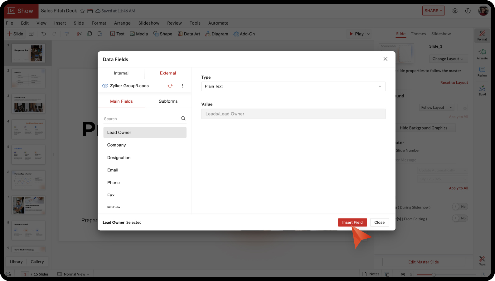 8. Click Insert Field to insert the selected field to your slide.