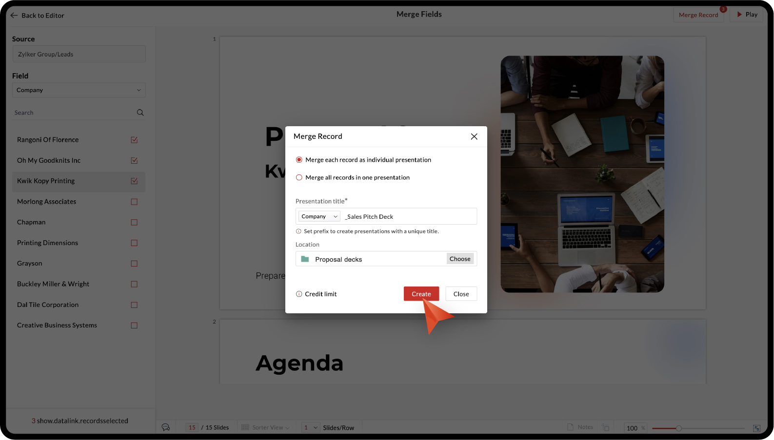 Note: You'll be able to choose a field you want to have as the prefix of the presentation title to help you differentiate if you merge each record as individual presentations.