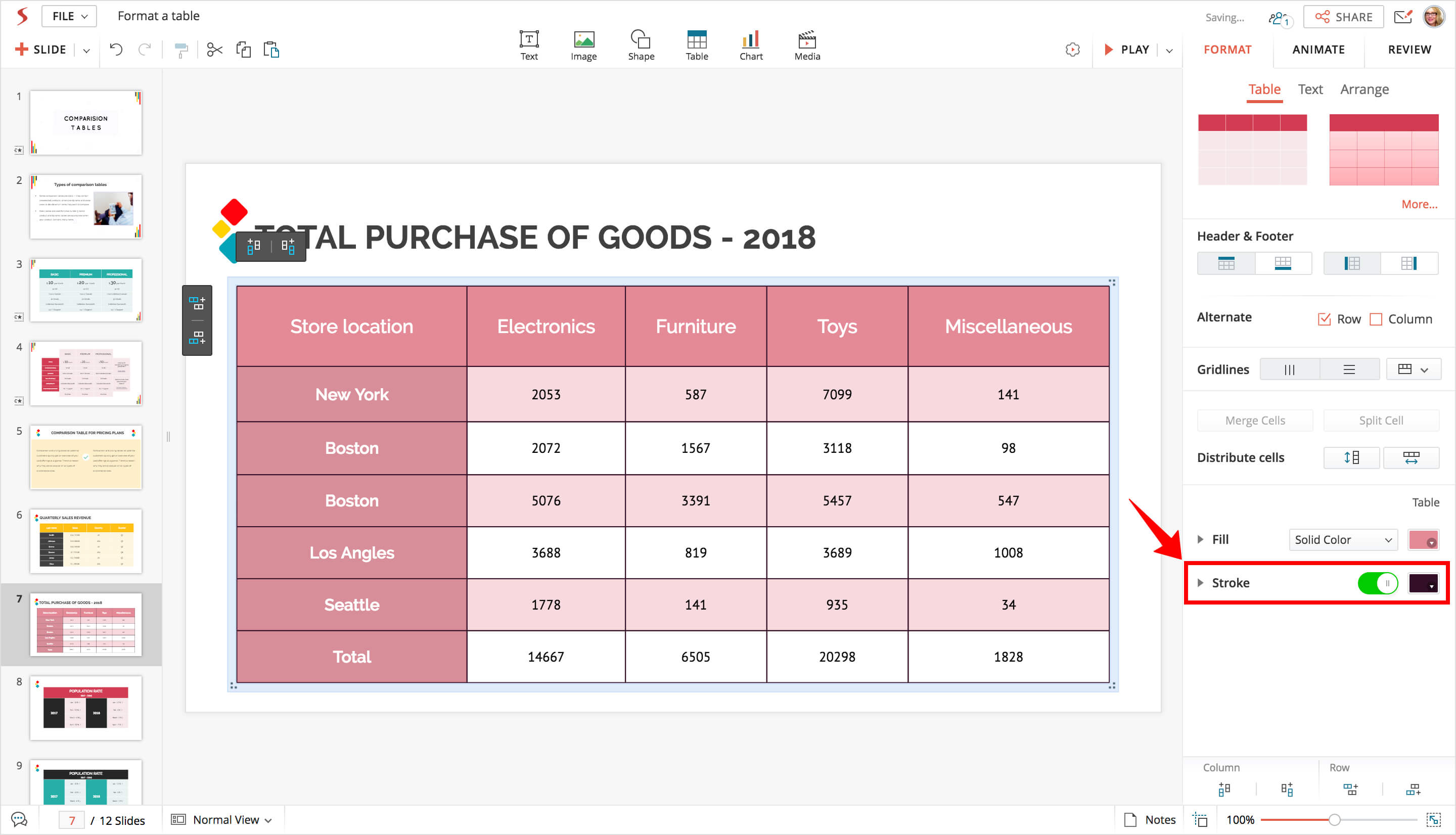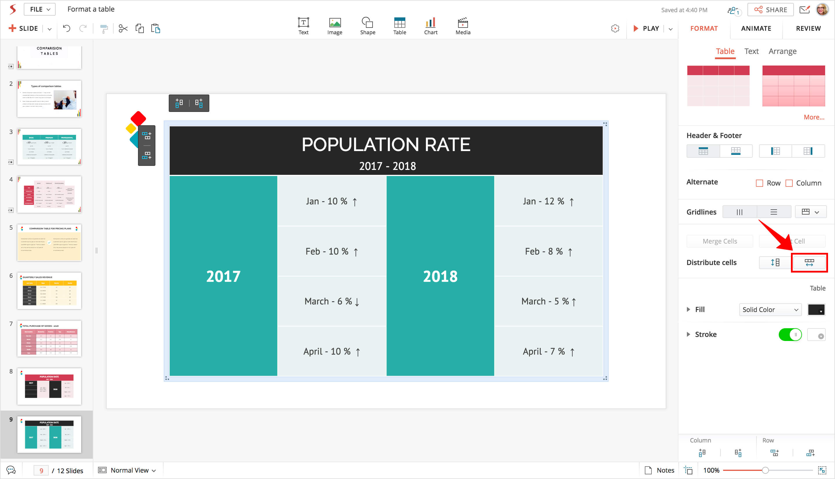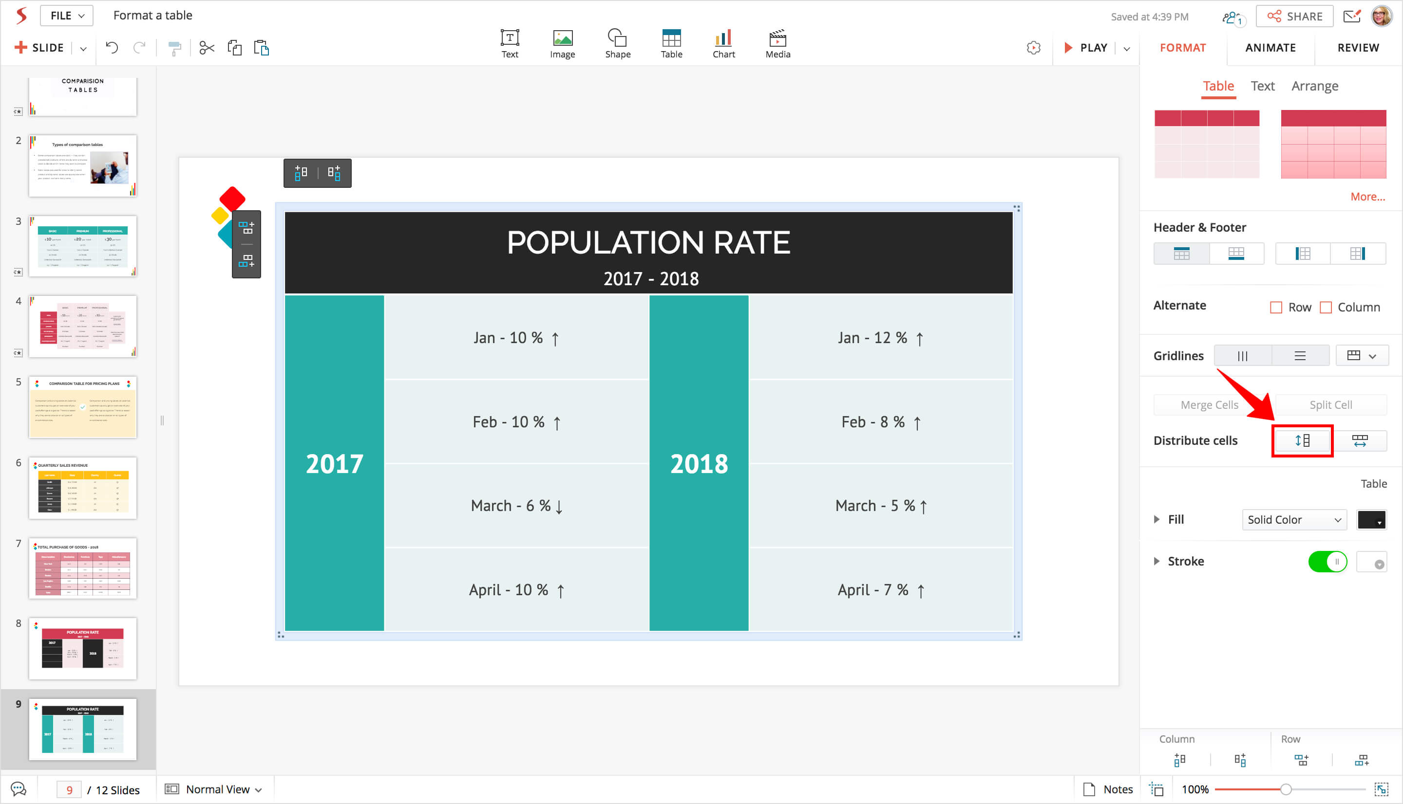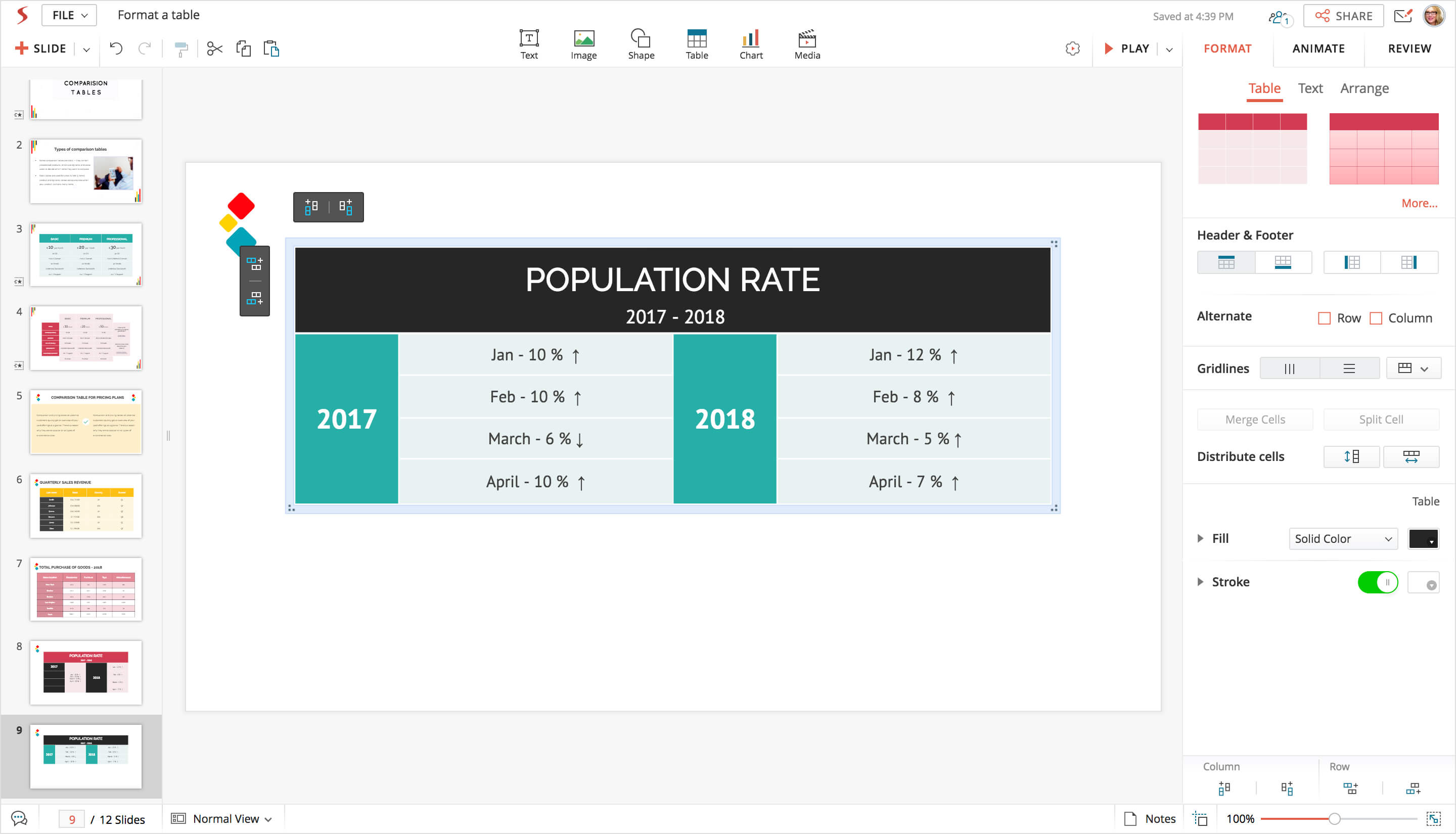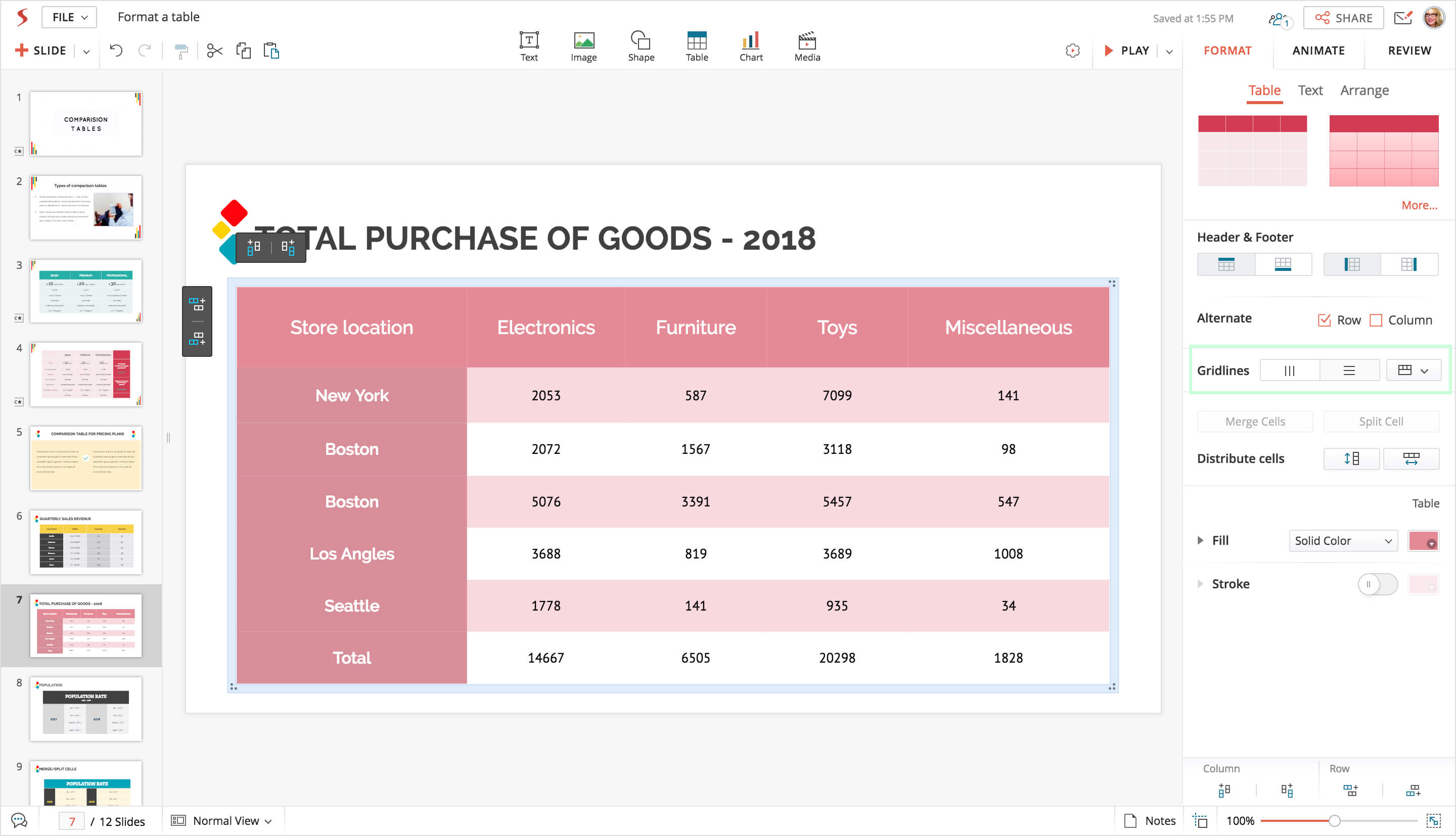 Make the table in your slides look more appealing with the use of table formatting functions. With these functions, you can apply styles, borders, backgrounds, gridlines and much more to your table to add a unique touch to the cells and information in your table. This can be helpful in comparing data across different rows and columns.