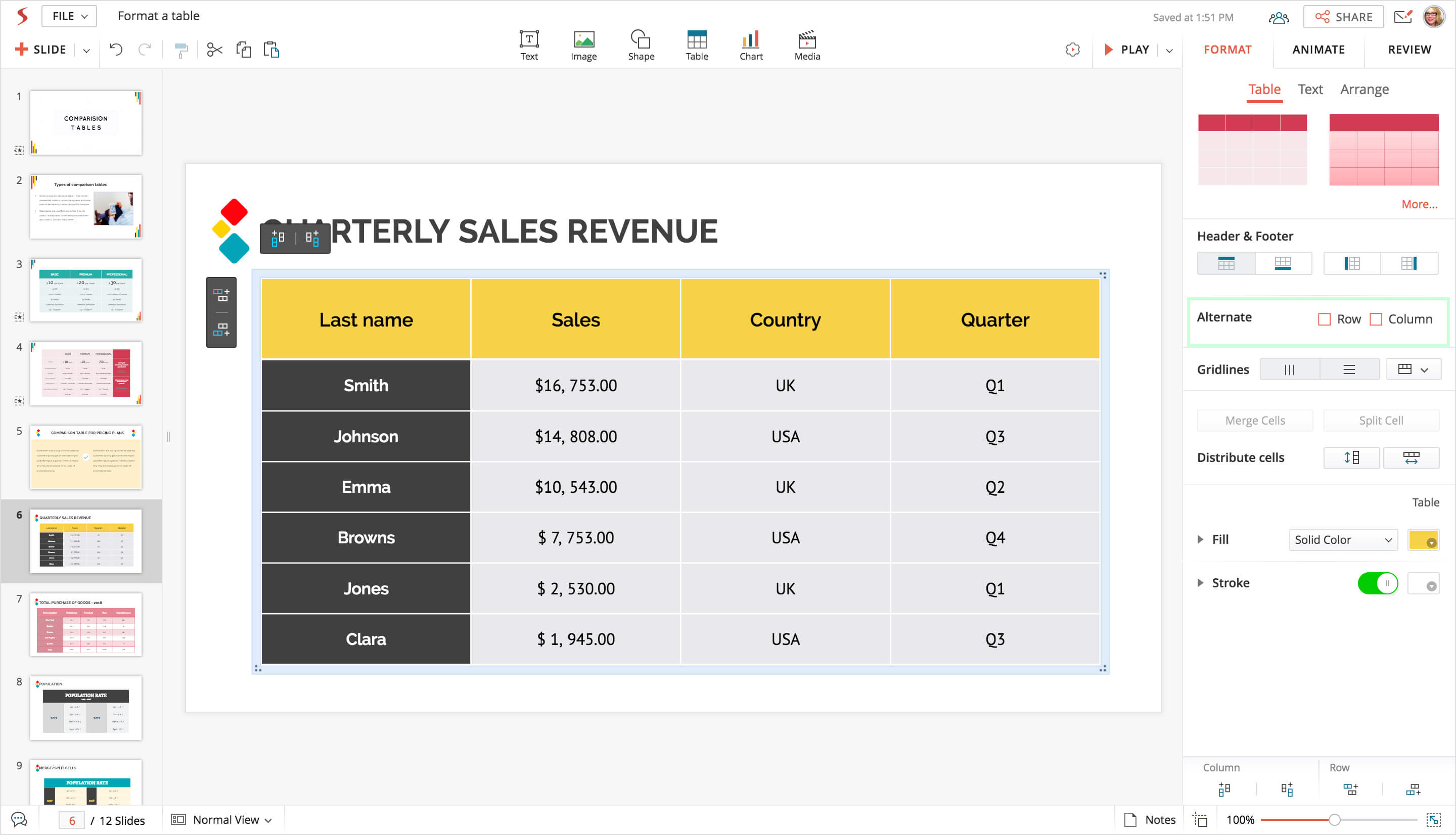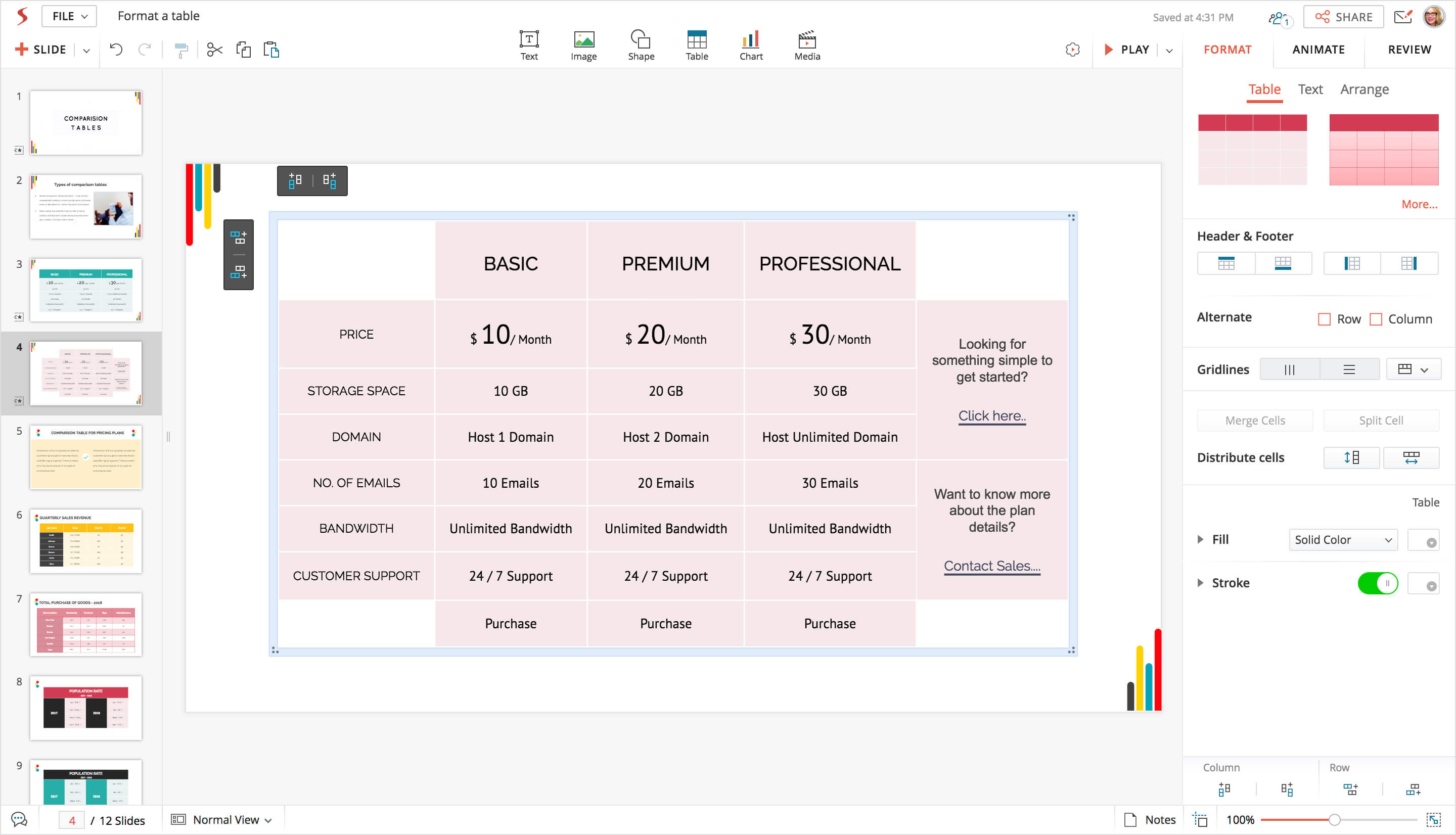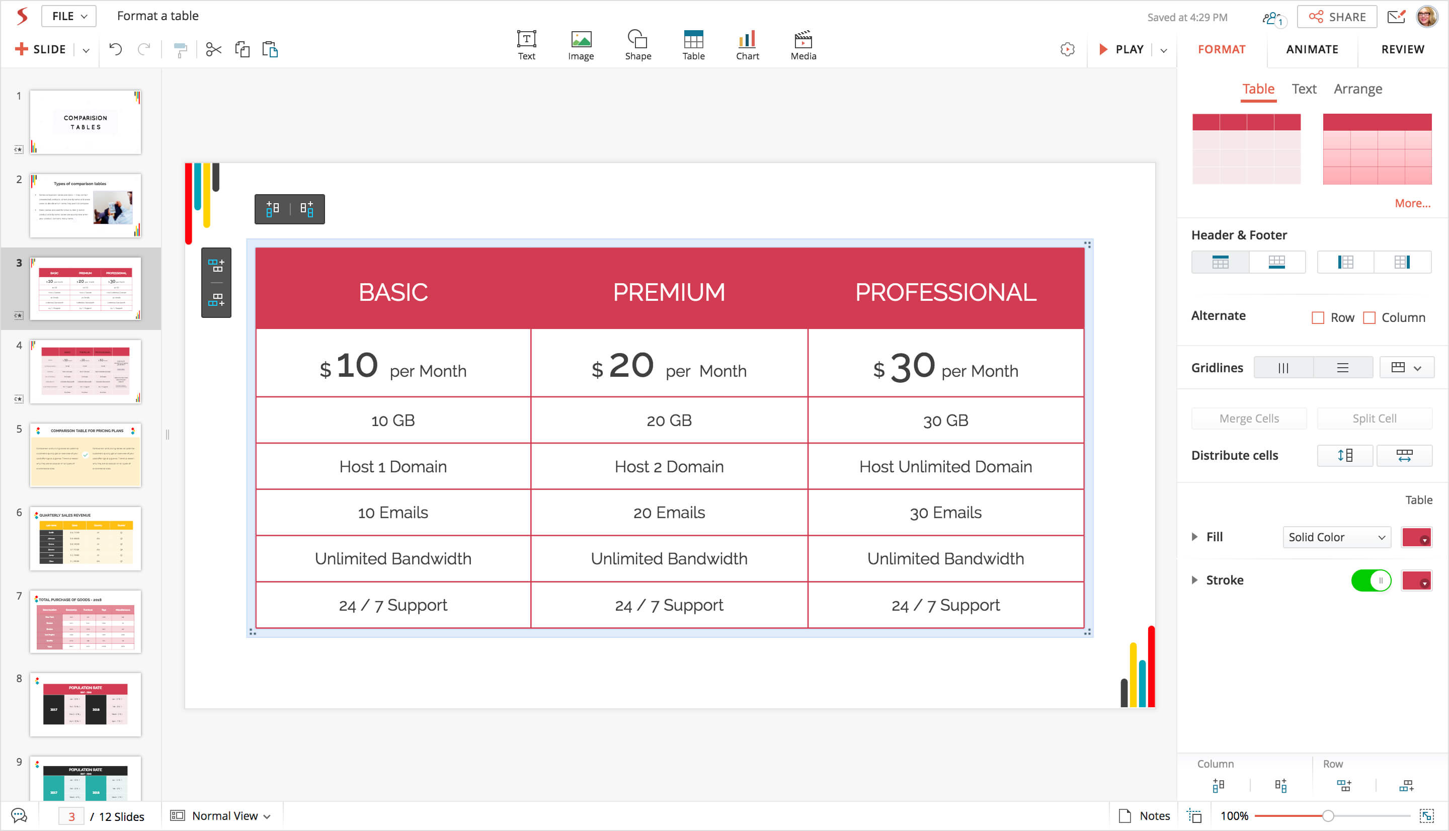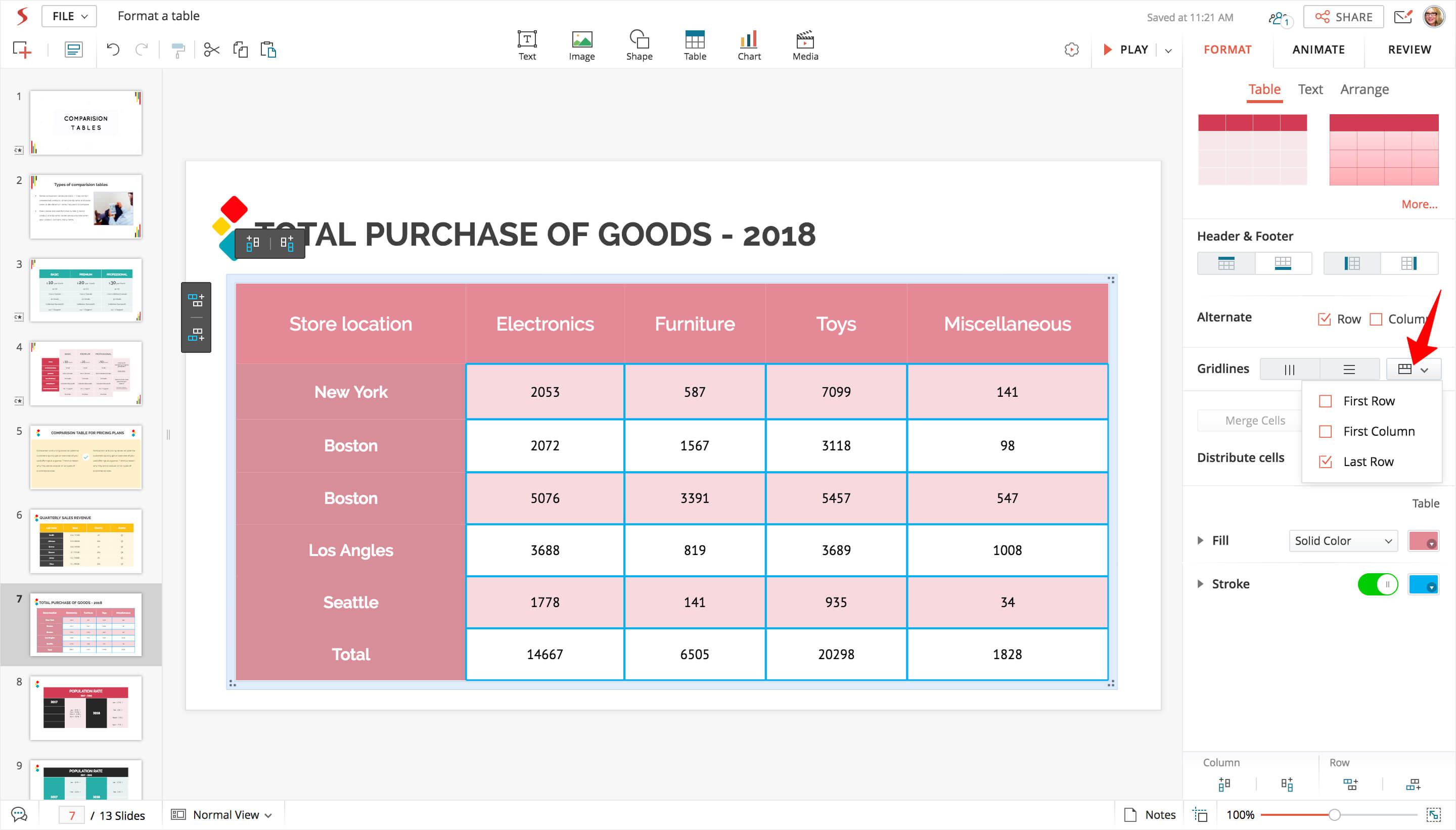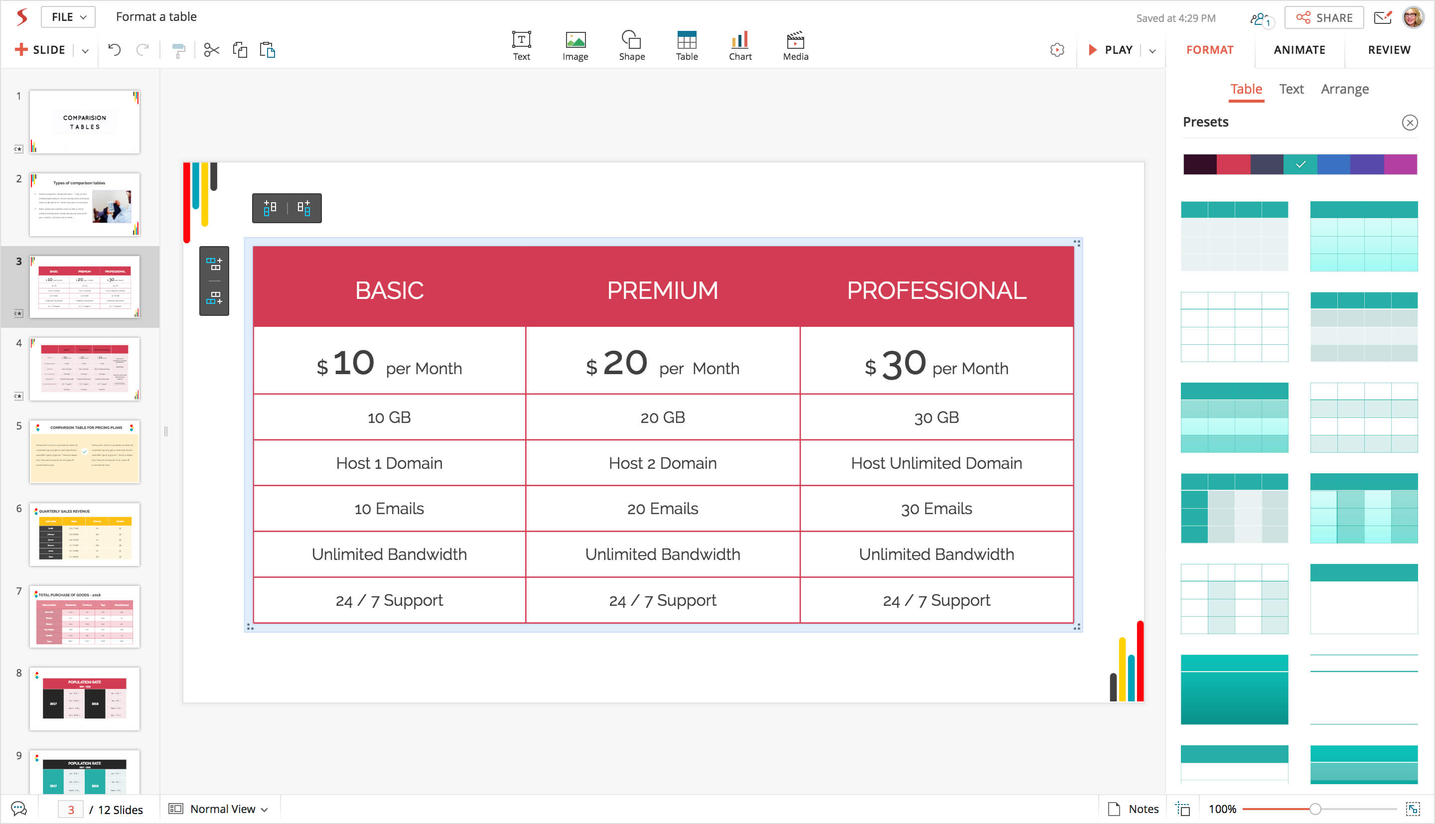 Make the table in your slides look more appealing with the use of table formatting functions. With these functions, you can apply styles, borders, backgrounds, gridlines and much more to your table to add a unique touch to the cells and information in your table. This can be helpful in comparing data across different rows and columns.