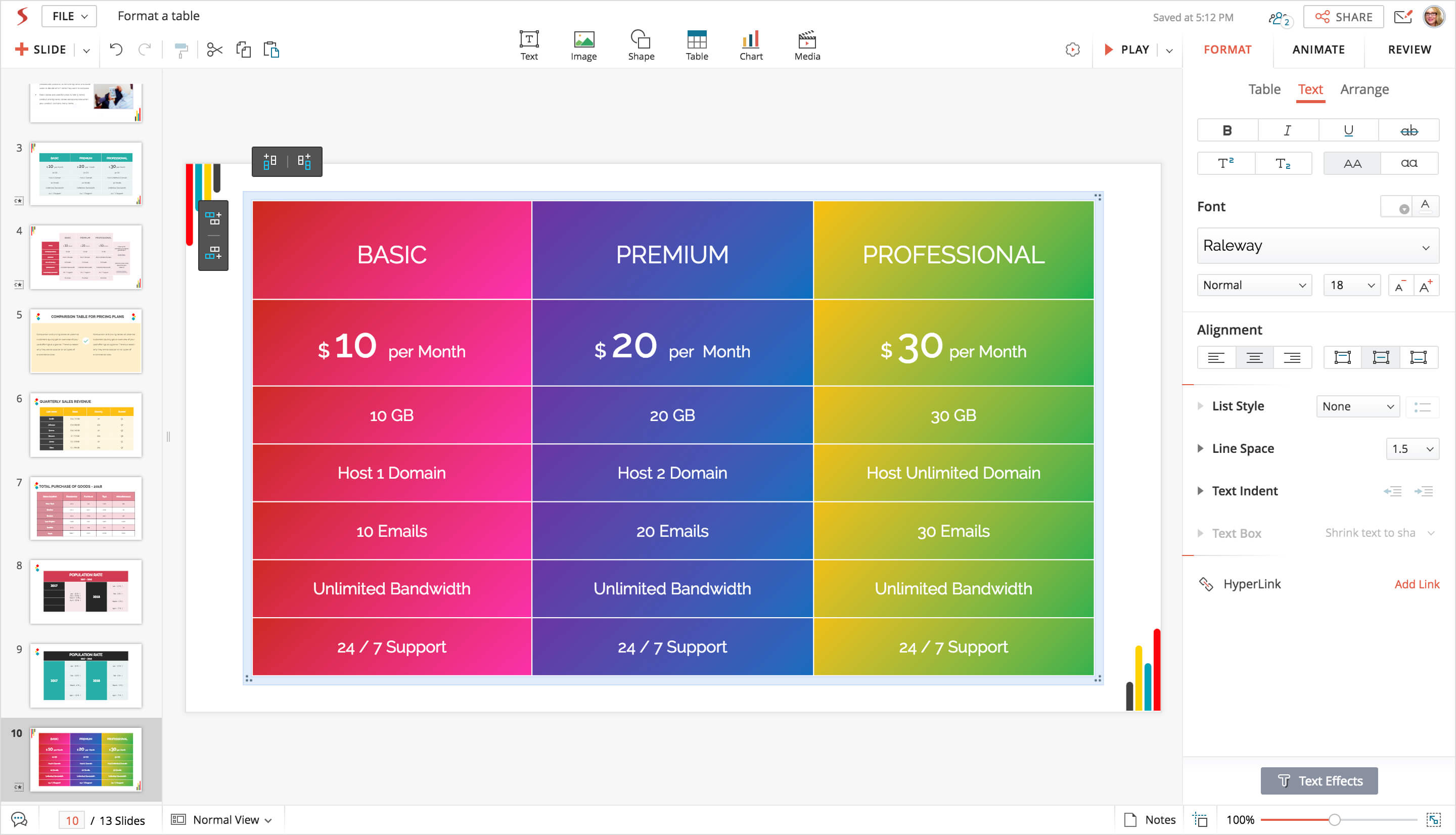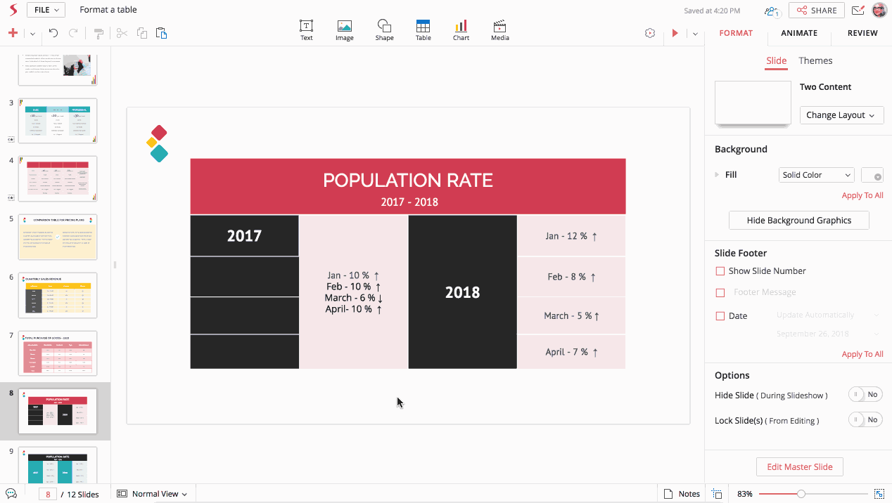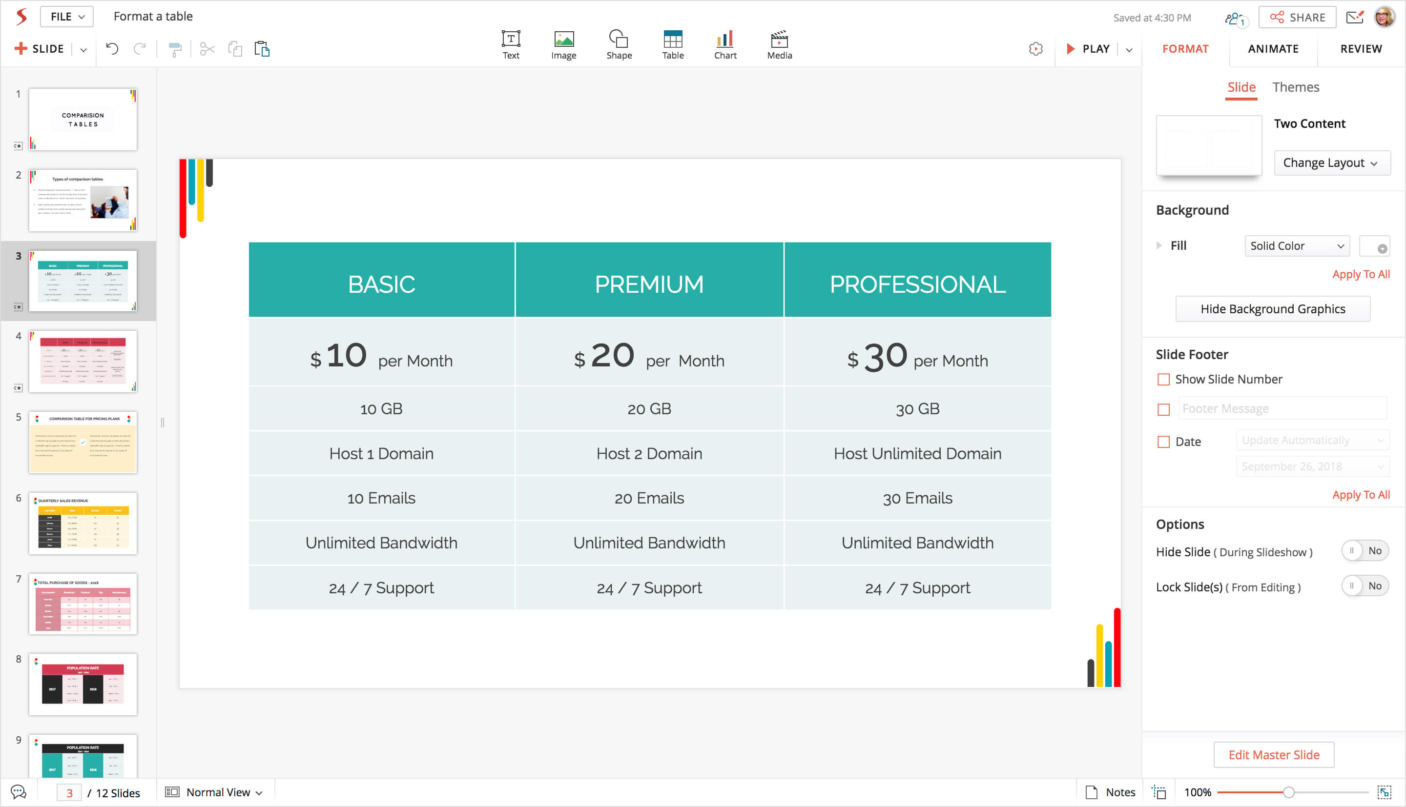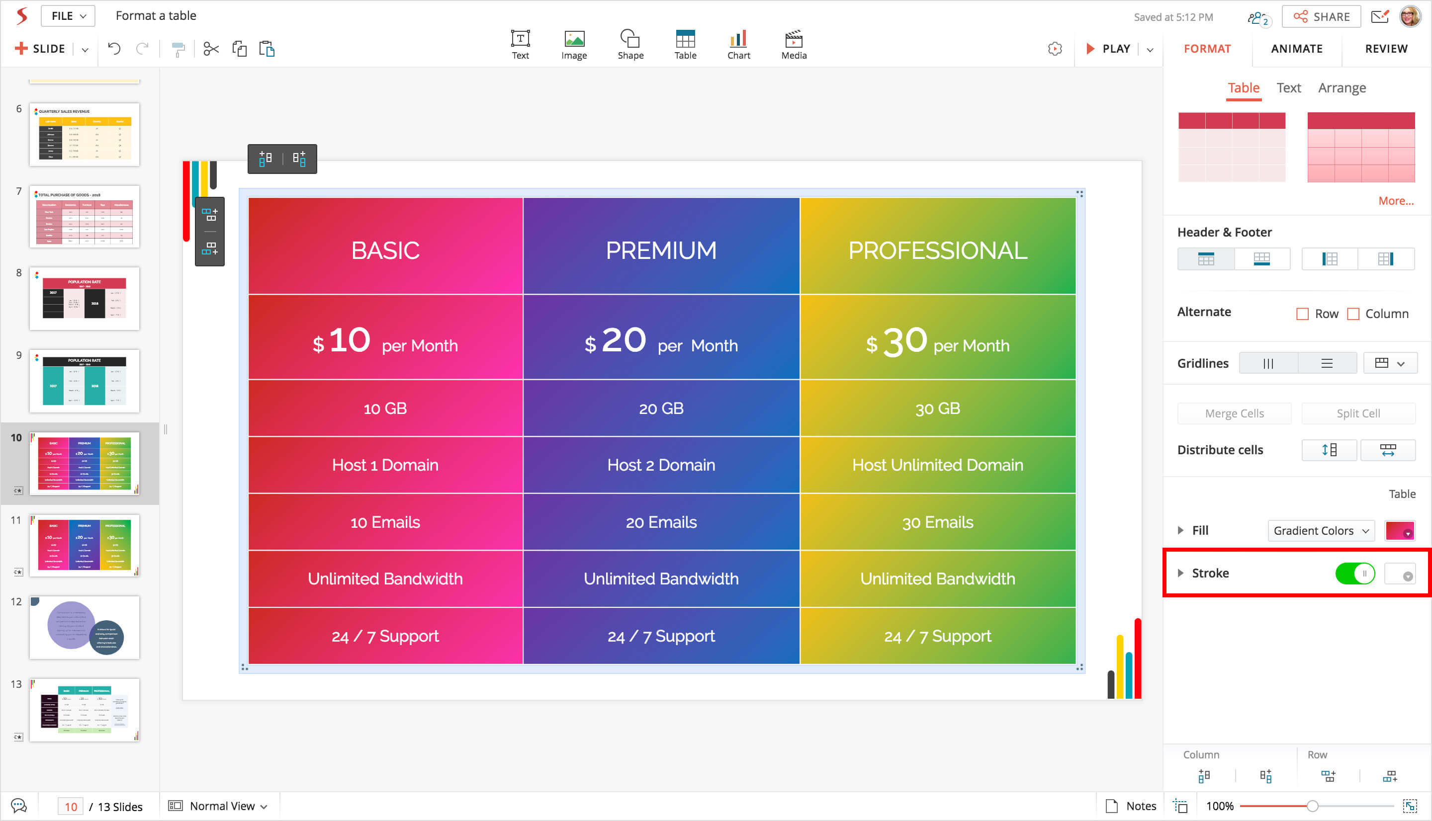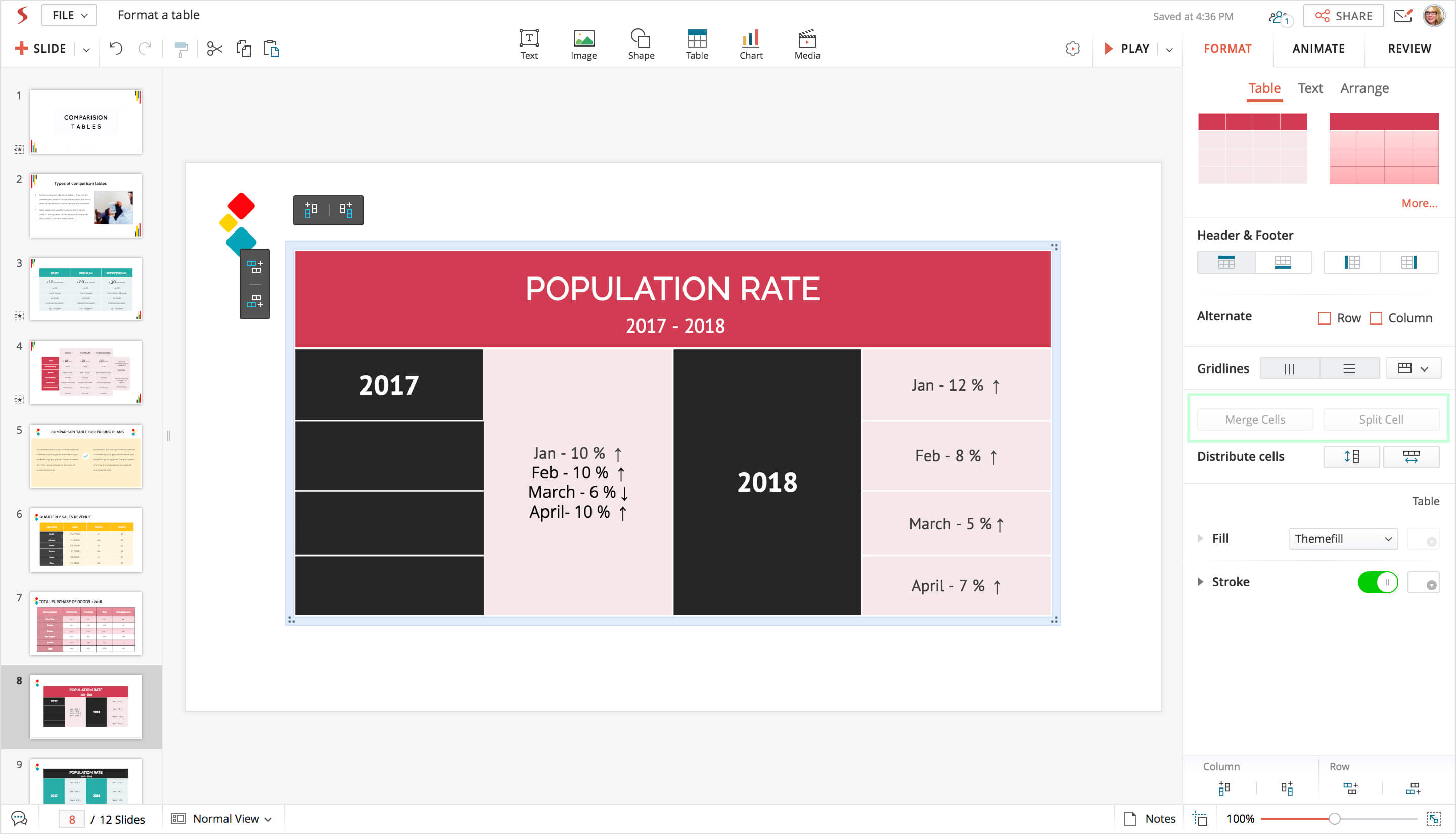 Make the table in your slides look more appealing with the use of table formatting functions. With these functions, you can apply styles, borders, backgrounds, gridlines and much more to your table to add a unique touch to the cells and information in your table. This can be helpful in comparing data across different rows and columns.