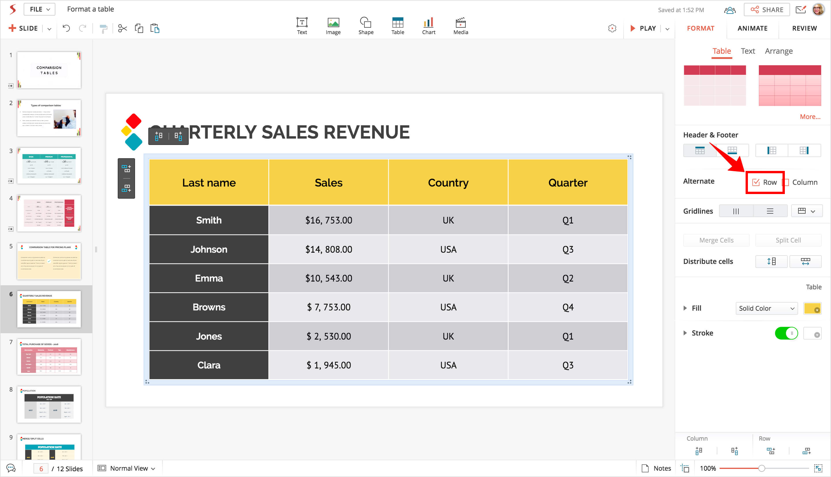 Row checkbox to shade every other row in the table. This is helpful when you need to easily read through, compare, and differentiate values and figures row-wise.