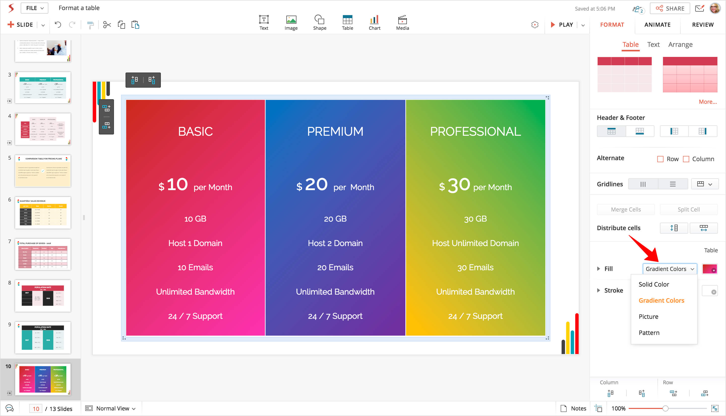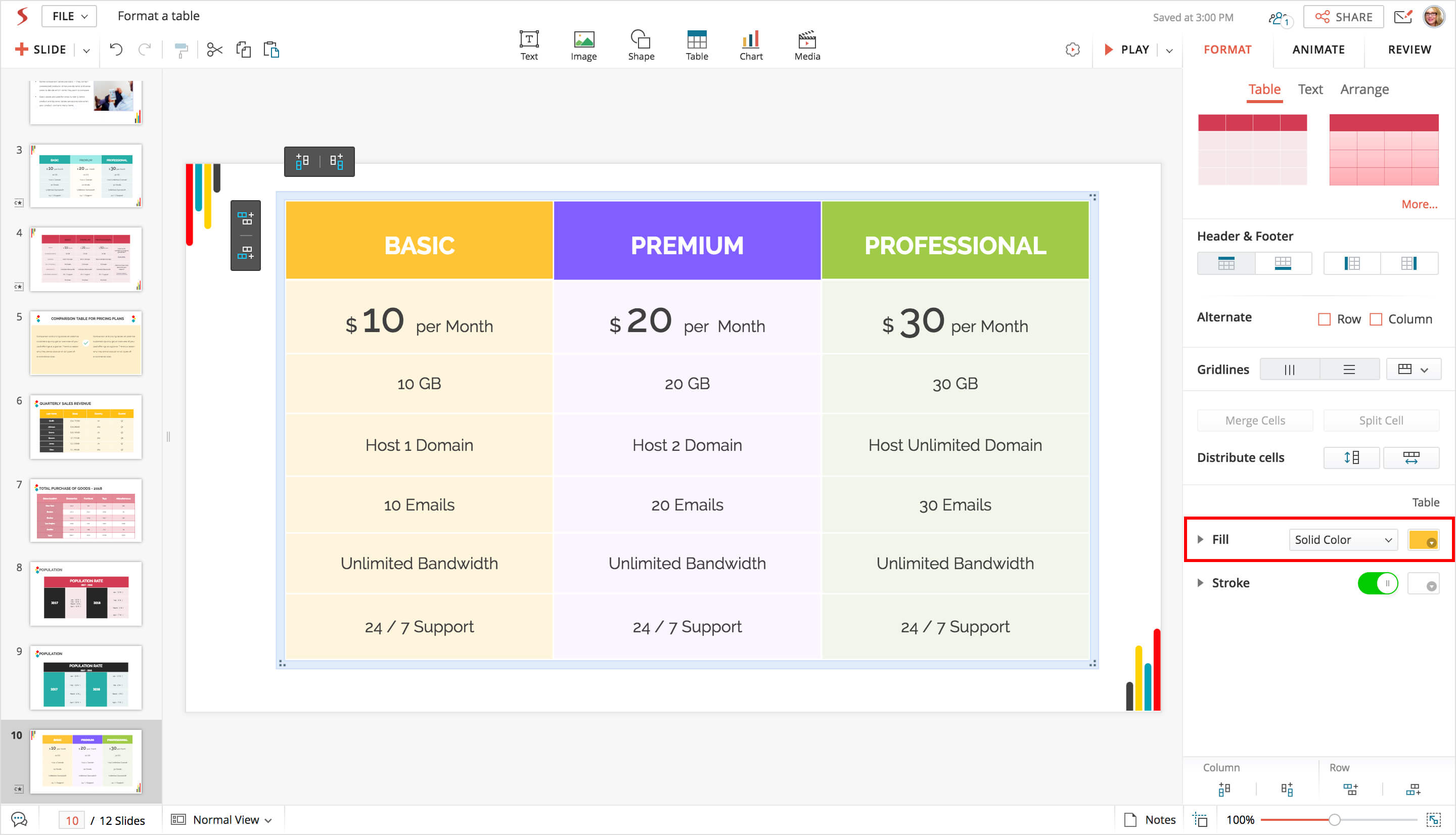 Highlight particular cells in your table by filling color or picture of your choice. A fill is the interior of the cells in the table. Fill colors can be applied to table row, column, or any individual cell of your choice in the table. You can also use table fill between alternate rows/columns to bring distinction among data and easily compare between elements in the table.
