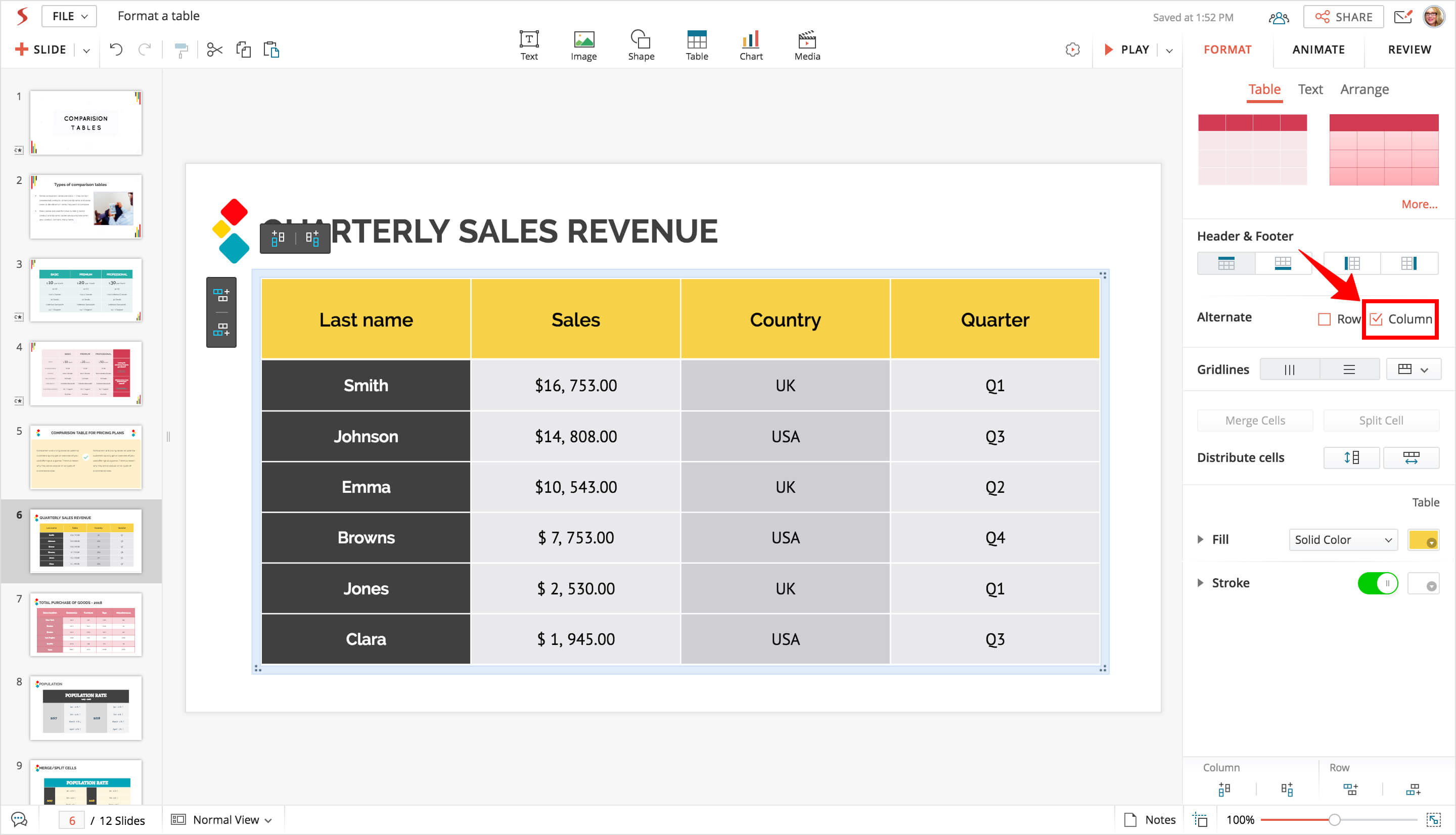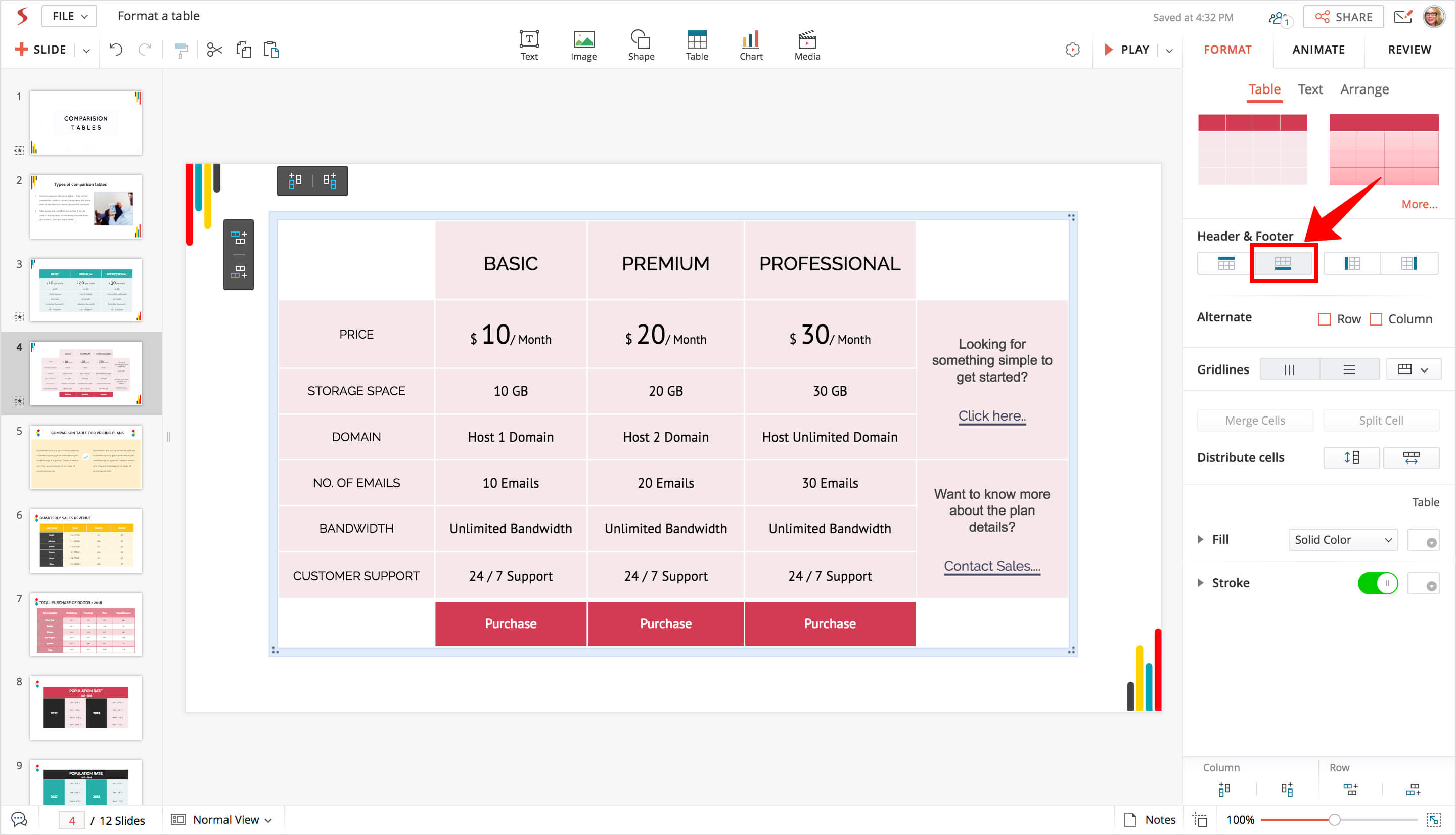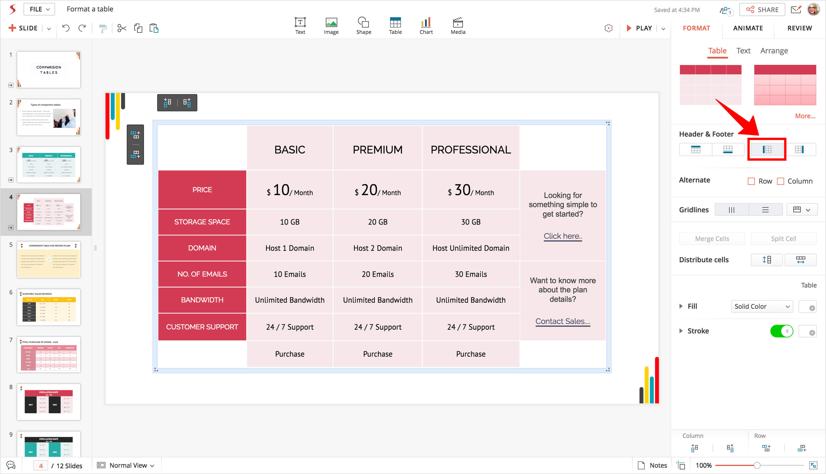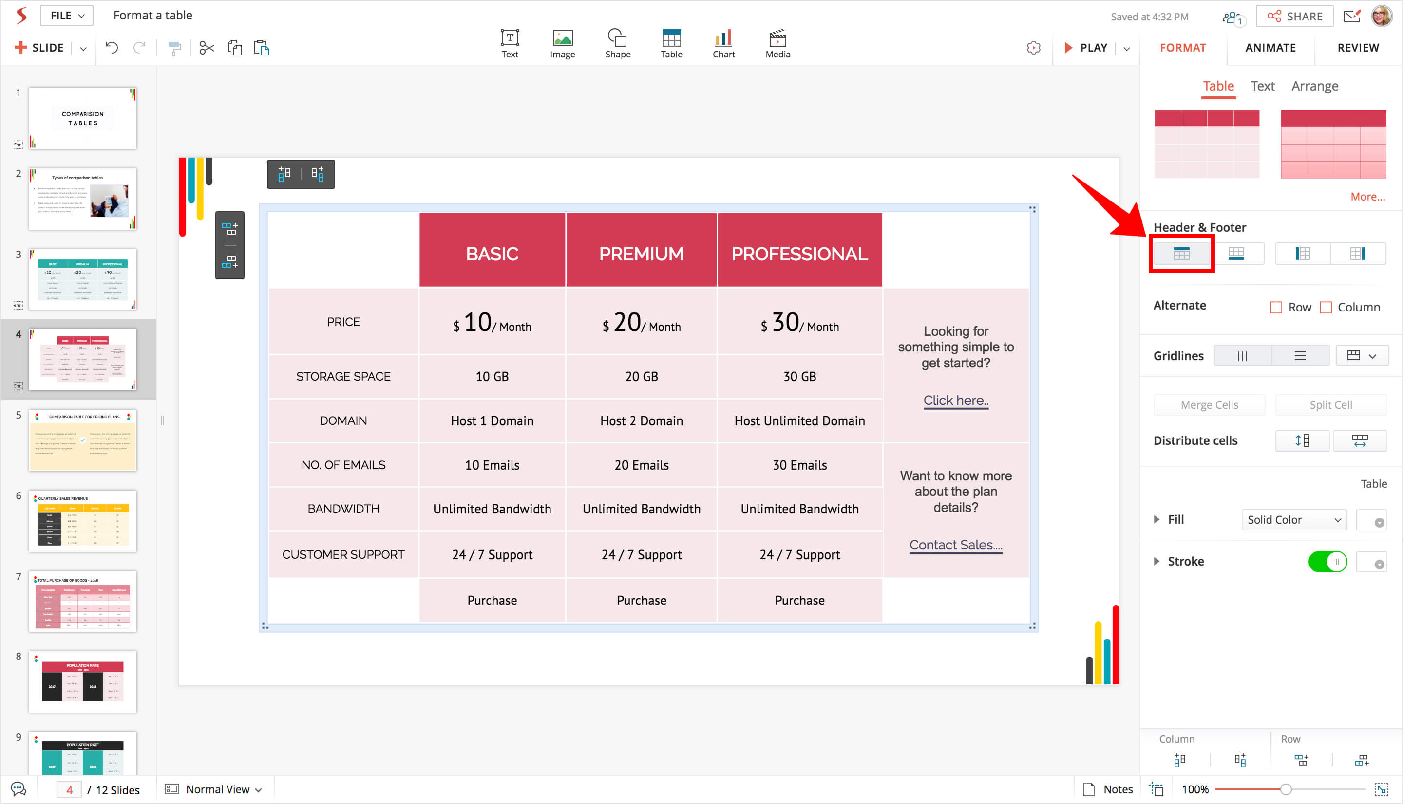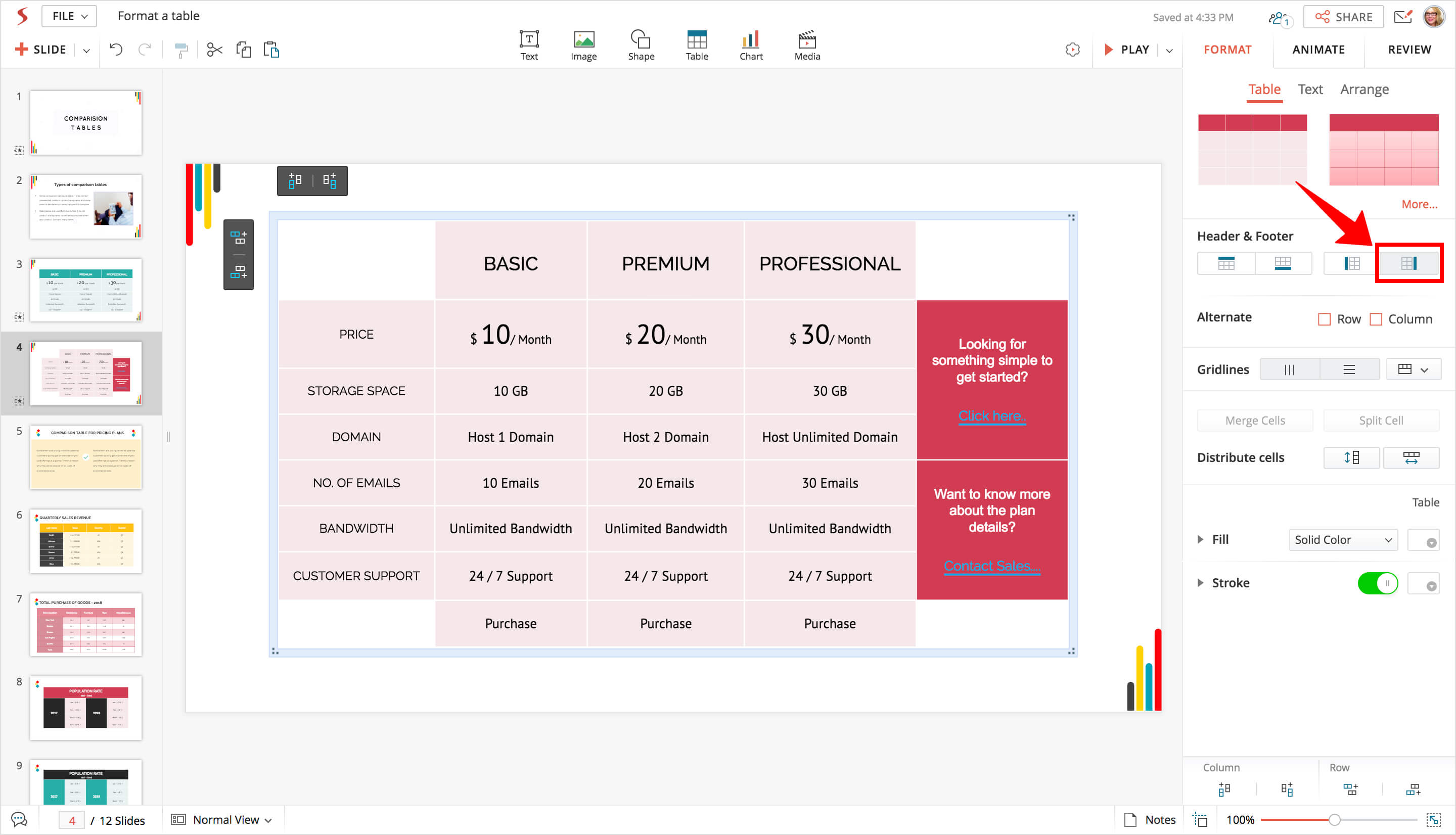Highlight and distinguish specific rows and columns in your table by choosing to apply table header and footer styles. A header is generally the topmost row, containing the title of the table. Similarly, the table footer is usually a row at the bottom of a table that helps wrap up the table rows and provide a summary or footnote that applies to some or all of the table. Headers and footers can be inserted both horizontally and vertically.