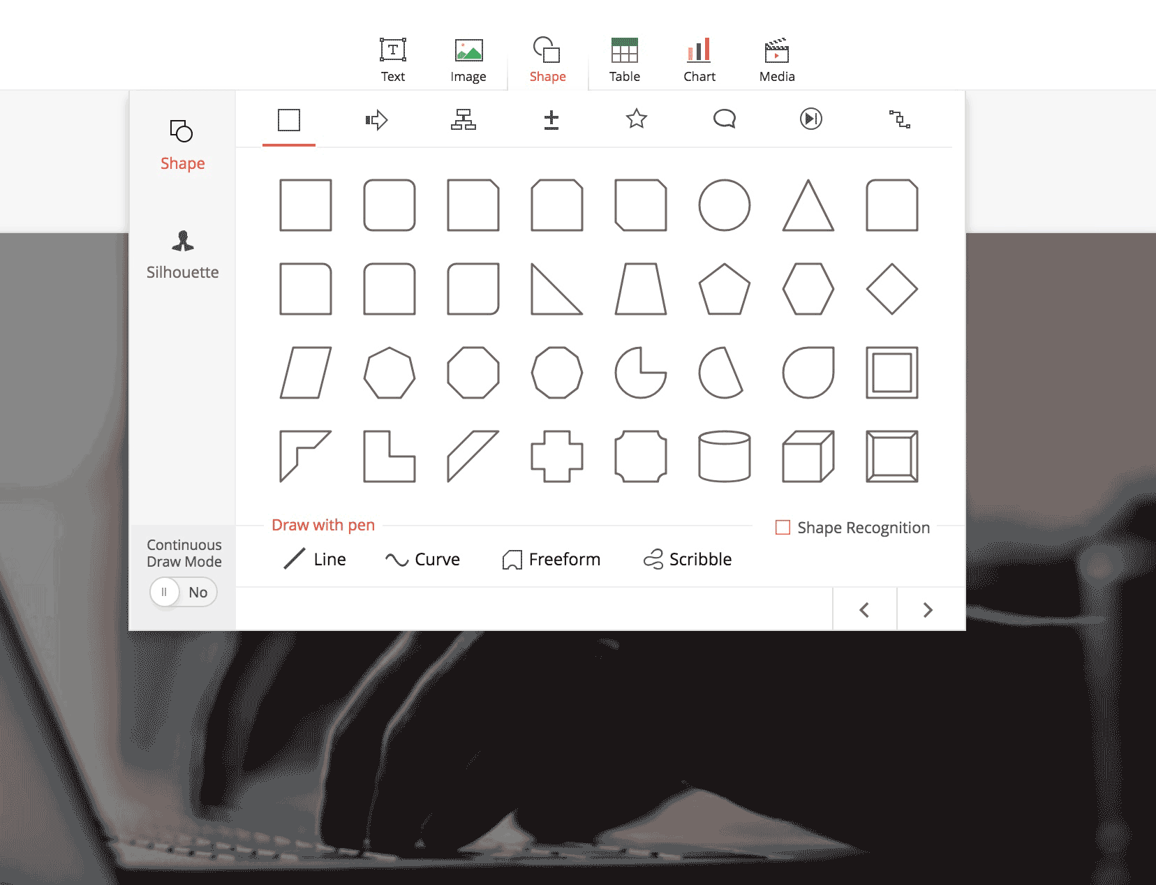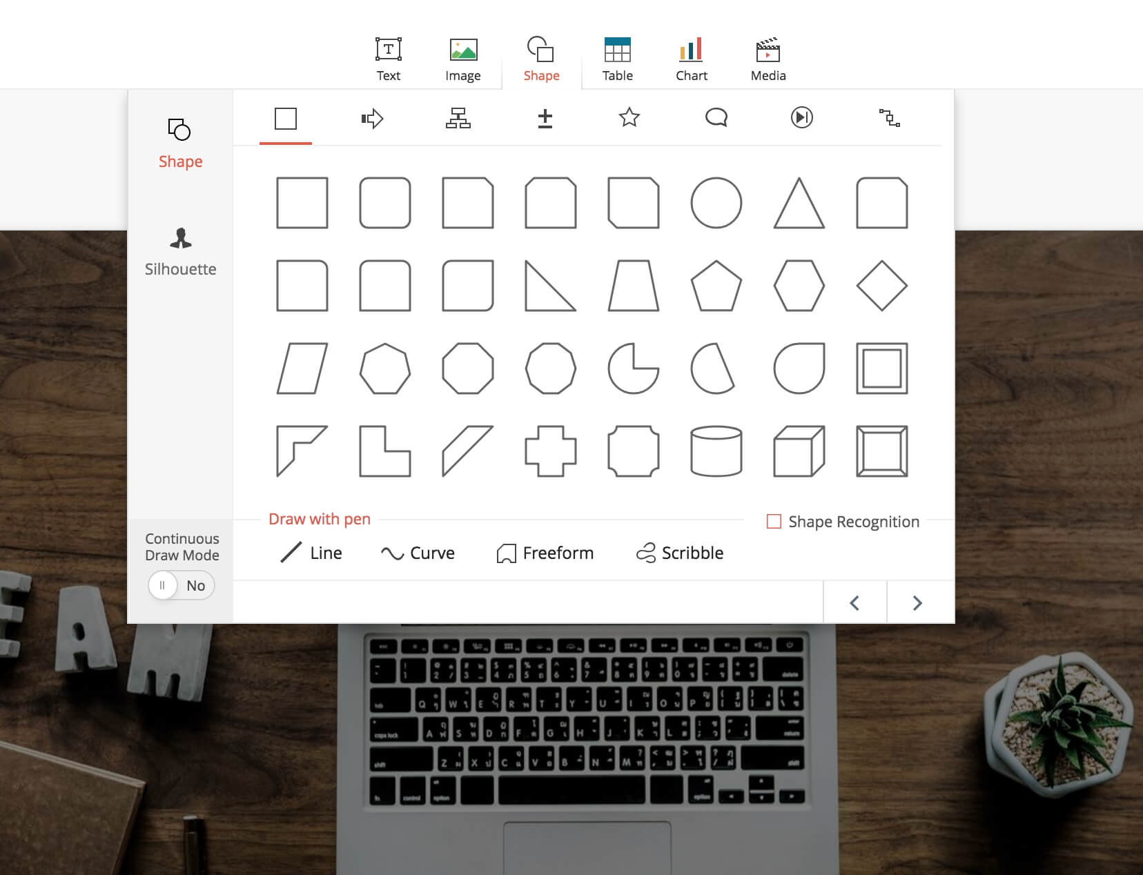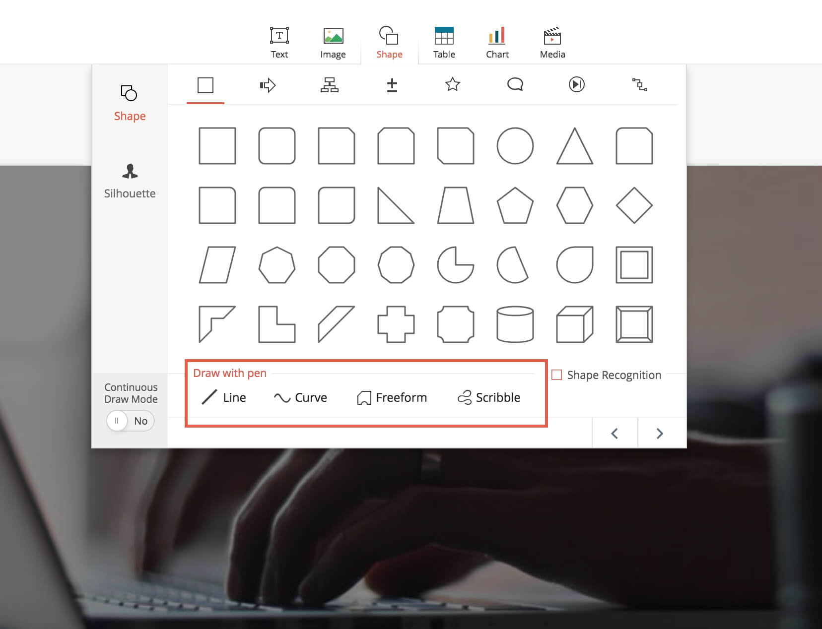 1. Select Shape from Insert section at the top and then choose Shape category at the left. Check the Shape Recognition checkbox to start drawing the outline of your desired shape and see your hand drawn shape transform into a polished shape.