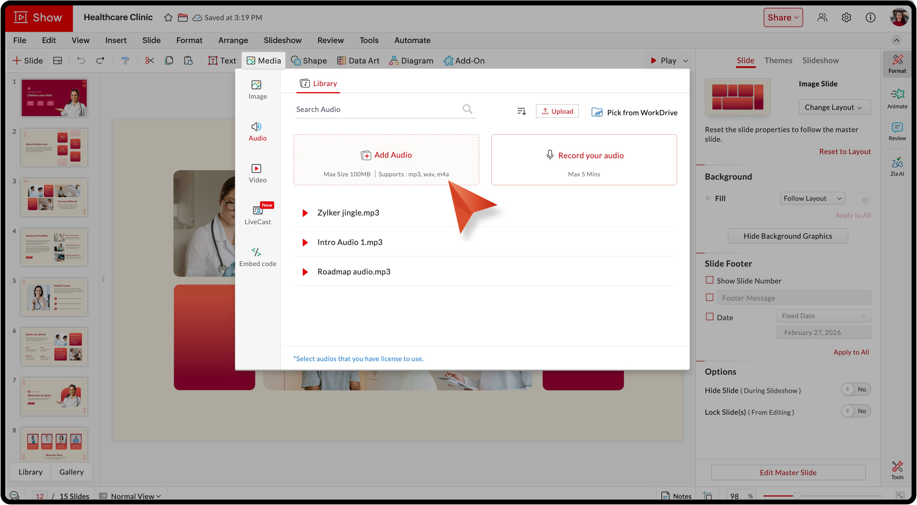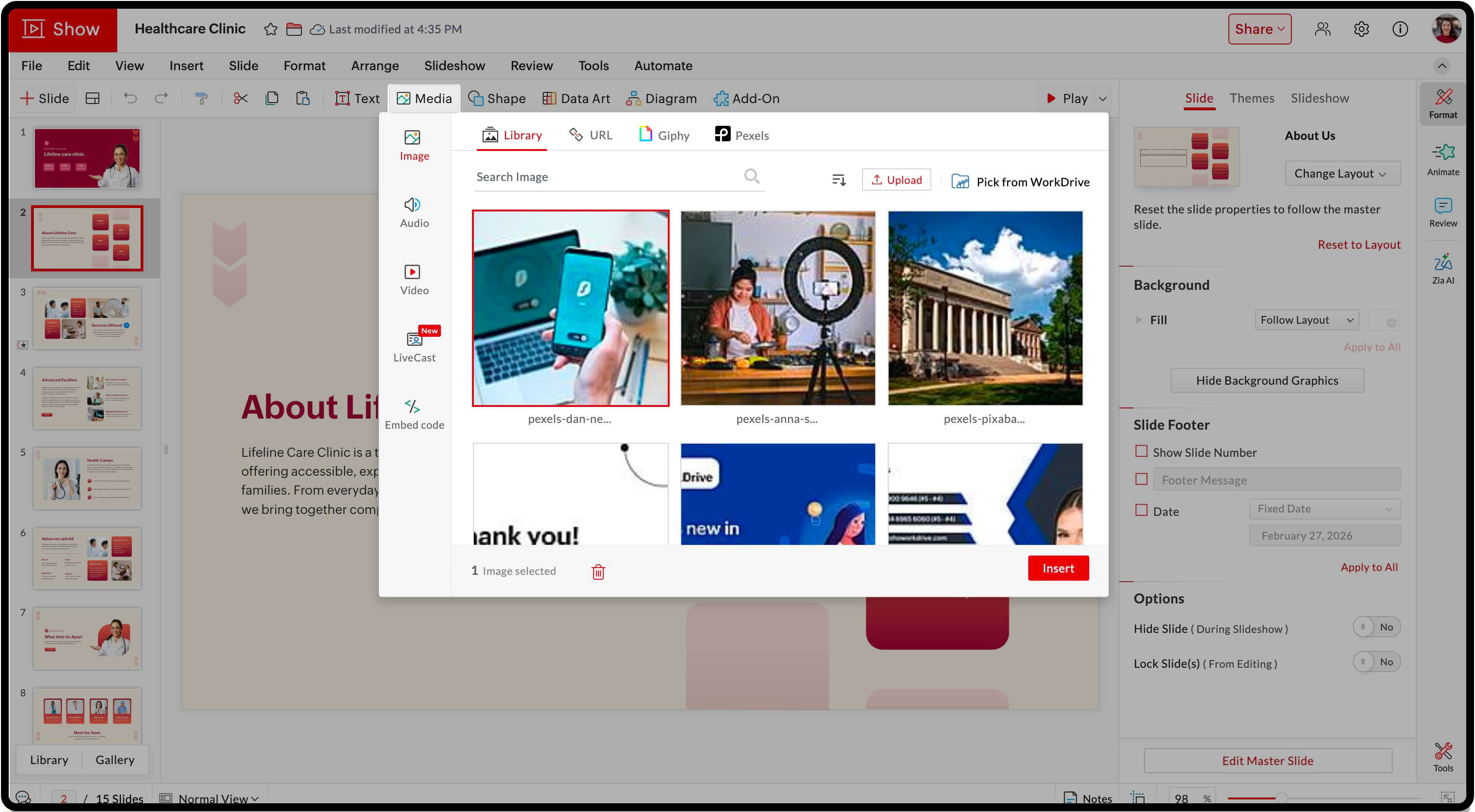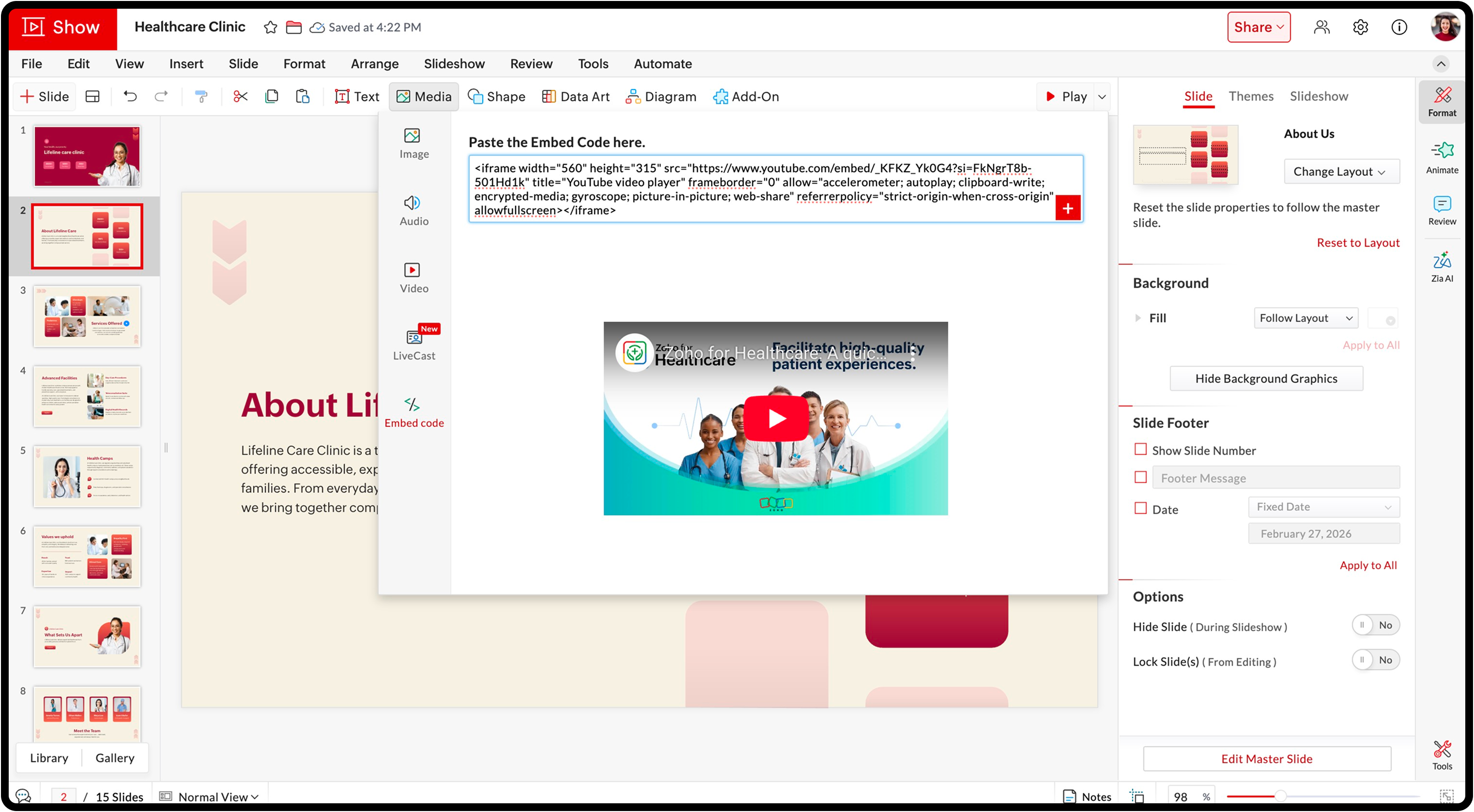Once you submit the form, the request will be raised. You'll be able to add embeds from the specific website once a moderator approves your request. To add an embed from the supported list of websites,Click Embed code in the left side on the Media window.