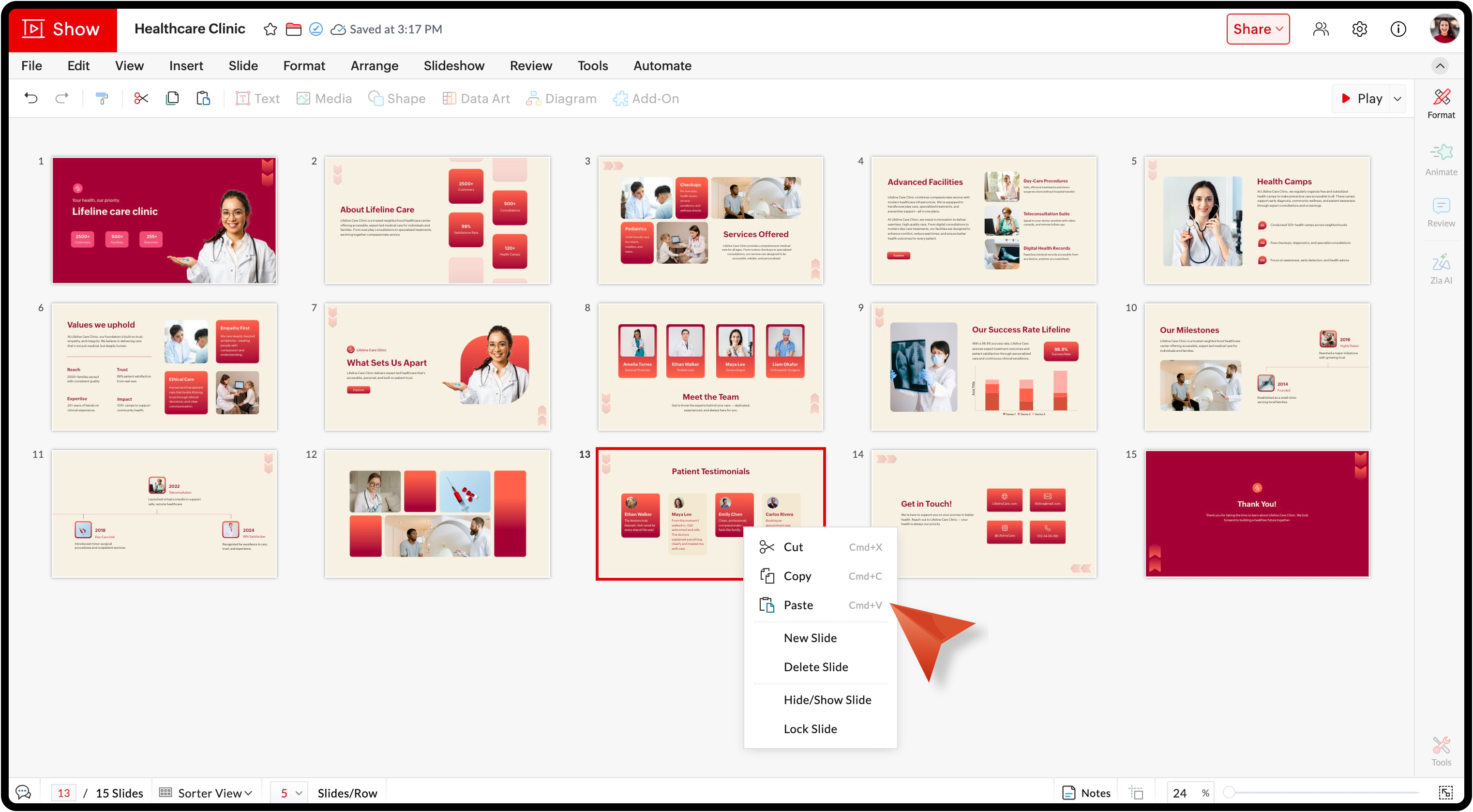 3. Click on a slide to Cut, Copy, Paste, New Slide (add a slide), Delete a Slide, Hide/ Show Slide, and Lock Slide.