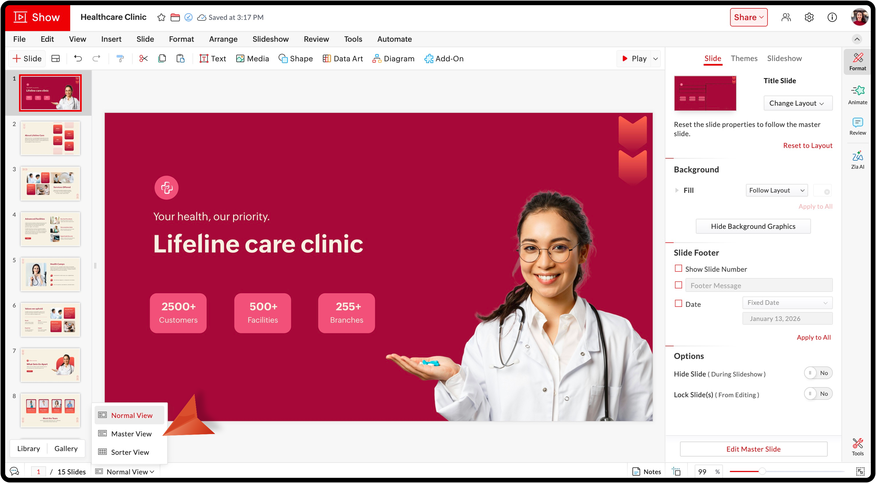 Presentations in Zoho Show can be viewed in three ways - Normal View, Master View, and Sorter View. Each view is designed for a specific purpose. These views are available as a dropdown at the bottom of the Show Editor.
