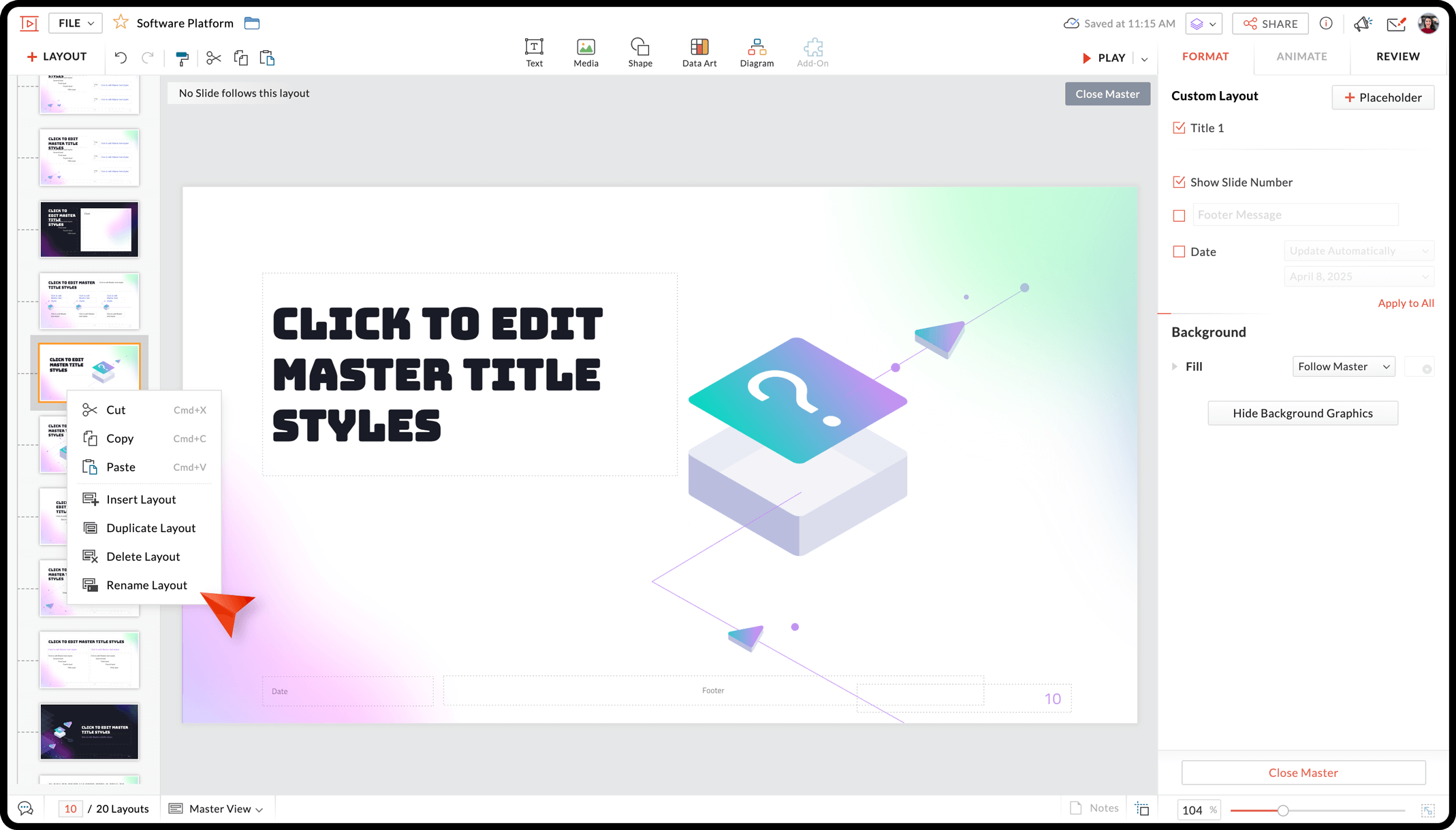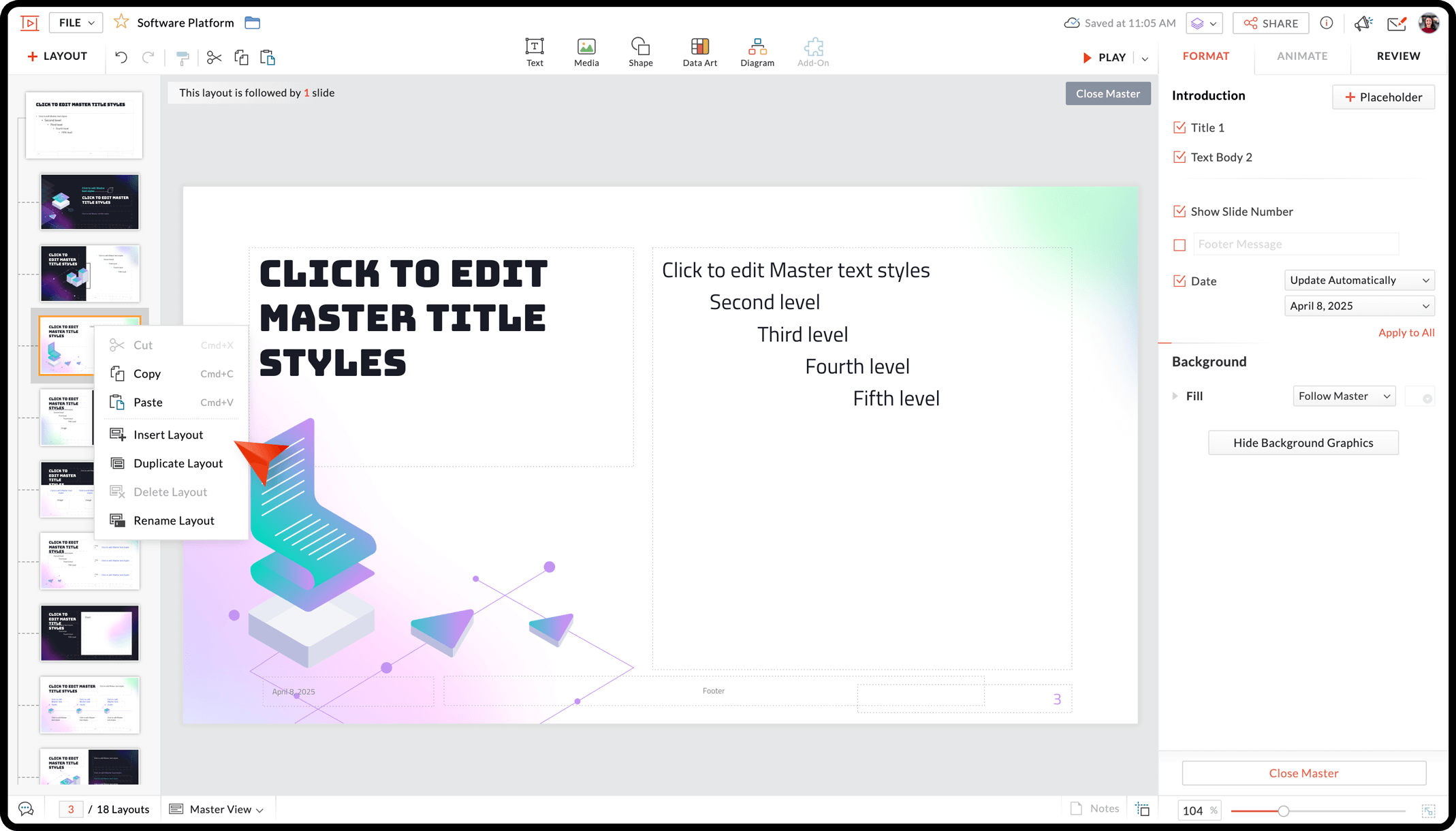 You can modify an existing layout and reuse it in your presentation. Instead of creating a layout from scratch, simply duplicate and rename an existing slide layout to save time. Show also enables you to delete unwanted or unused slide layouts within the Master View. Any slides that are currently following this layout in your presentation will be highlighted in the thumbnail panel at the left of the screen.