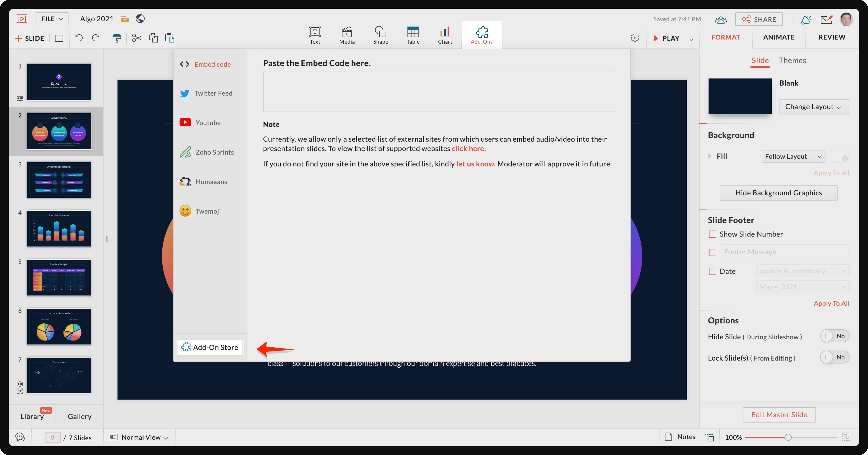 Download the Zoho Show app from the Play Store on your android device to create a new presentation or to add a presentation from any of the file storage app. You can set up Zoho Show account using either your email address or your social media ...