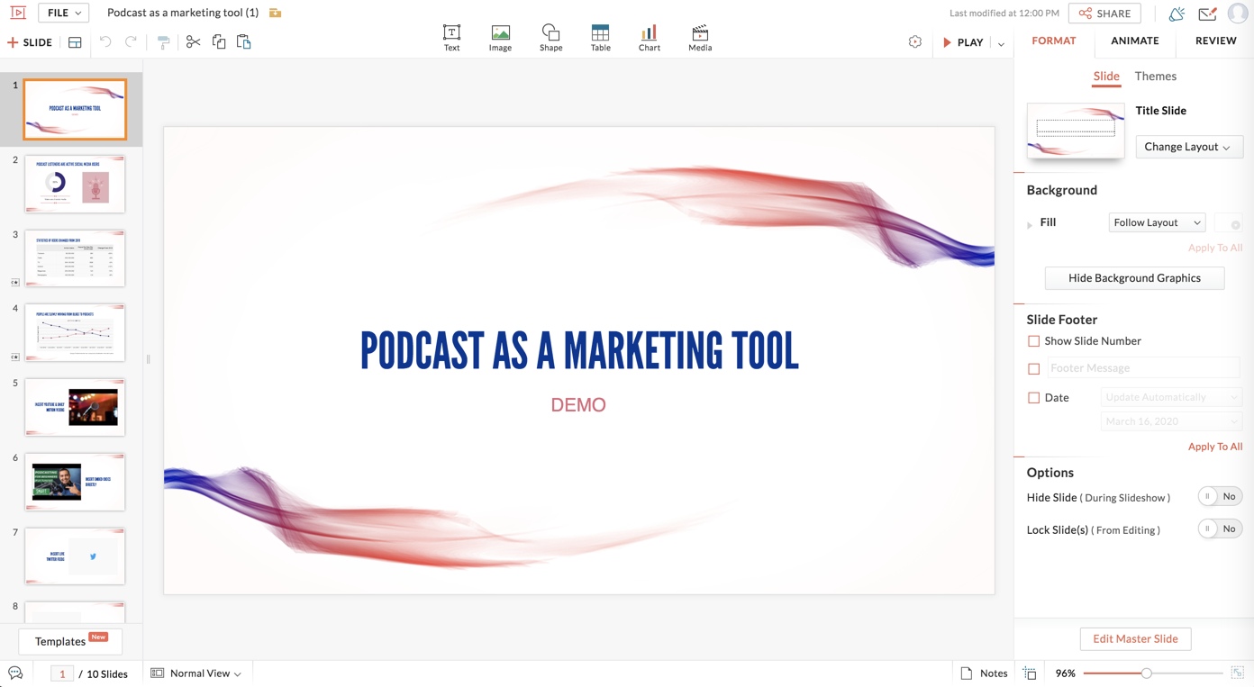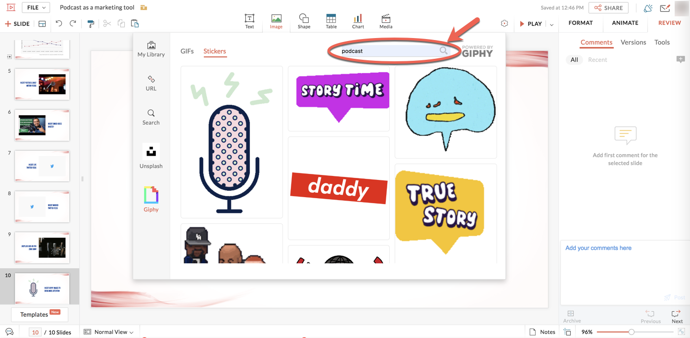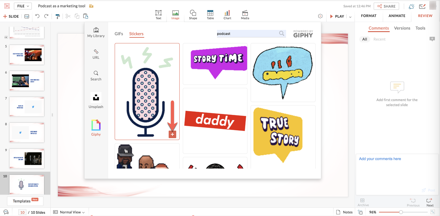 Zoho Show has integrated with Giphy to help you to create, share, and collaborate much better presentations with audiences. With Giphy add-on, you can add gifs to enliven ideas dynamically in presentations.