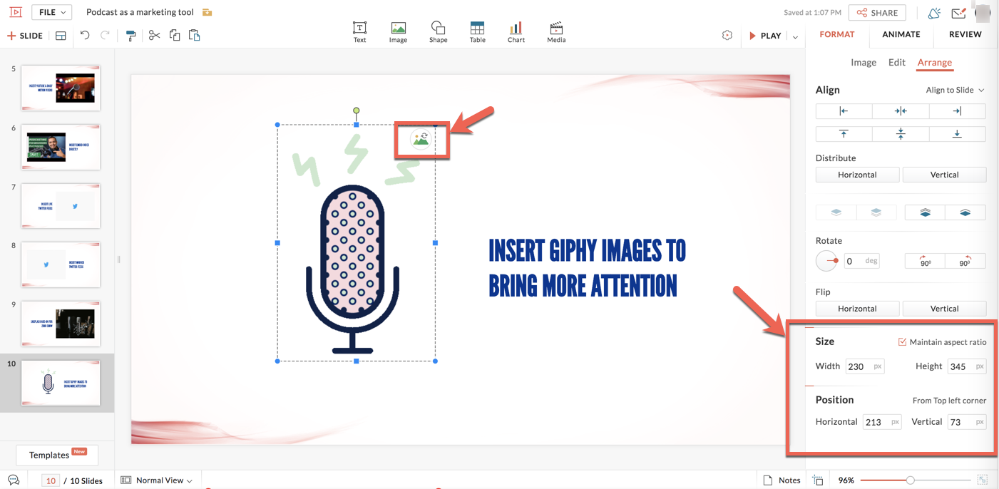 5. Resize the gif using anchor points or Size and Position arrows under Arrange. You can also format, animate, and review the gif using the contextual toolbar. You may change the gif using the Change Image icon.