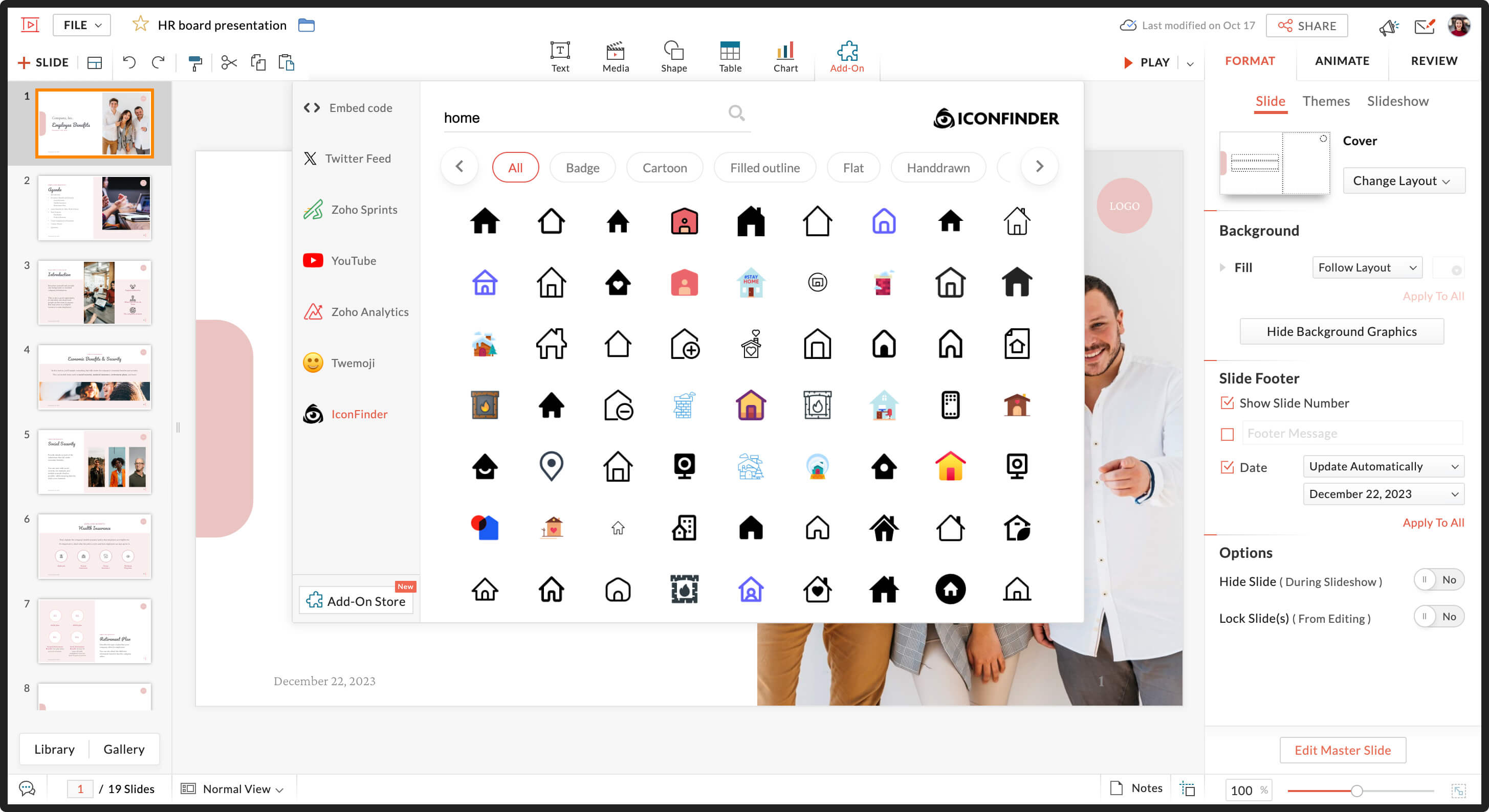 Zoho Show has integrated with Iconfinder to help you find and add relevant icons to your slides. Icons are classified into Badge, Cartoon, Filled outline, Flat, Hand drawn, Isometric, Long Shadow, Outline, Pixel, Semi- Solid, Smooth, Solid, and Other. You can choose the one that best fits your slide design.