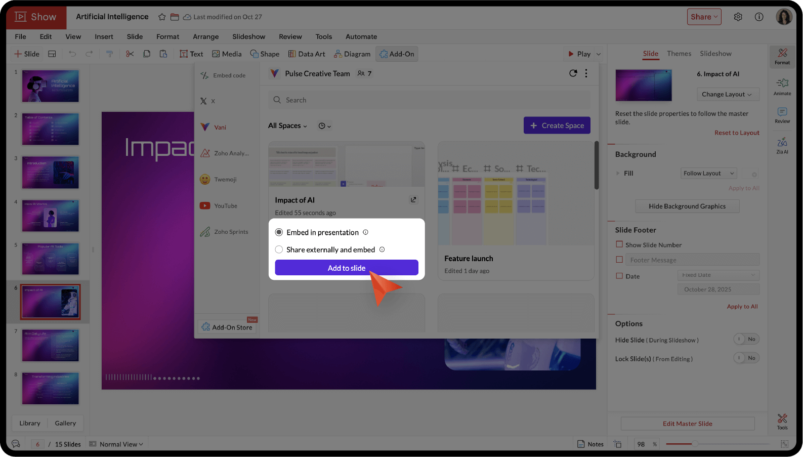 Zoho Show integrates with Vani to let you embed spaces such as mind maps, boards, or brainstorming canvases into your slides. This allows you to present ideas along with the supporting collaboration, keeping your content structured and connected.