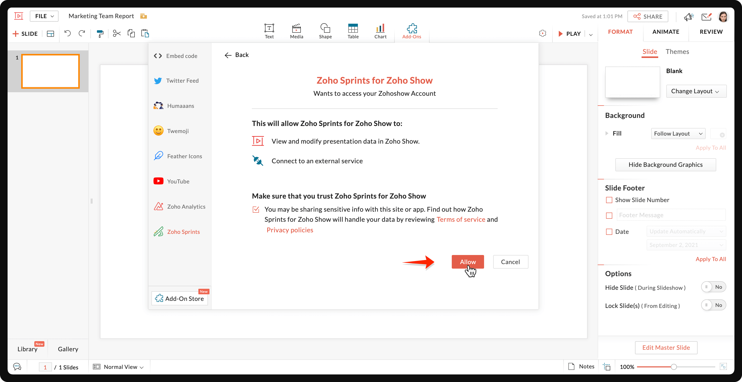After you click Install, a permission screen will appear. Click Allow in the screen. Zoho Sprints will be installed under the Add-Ons section.