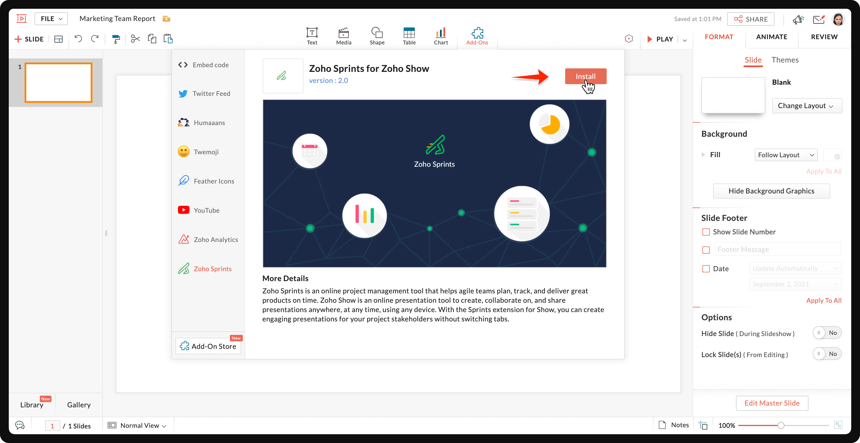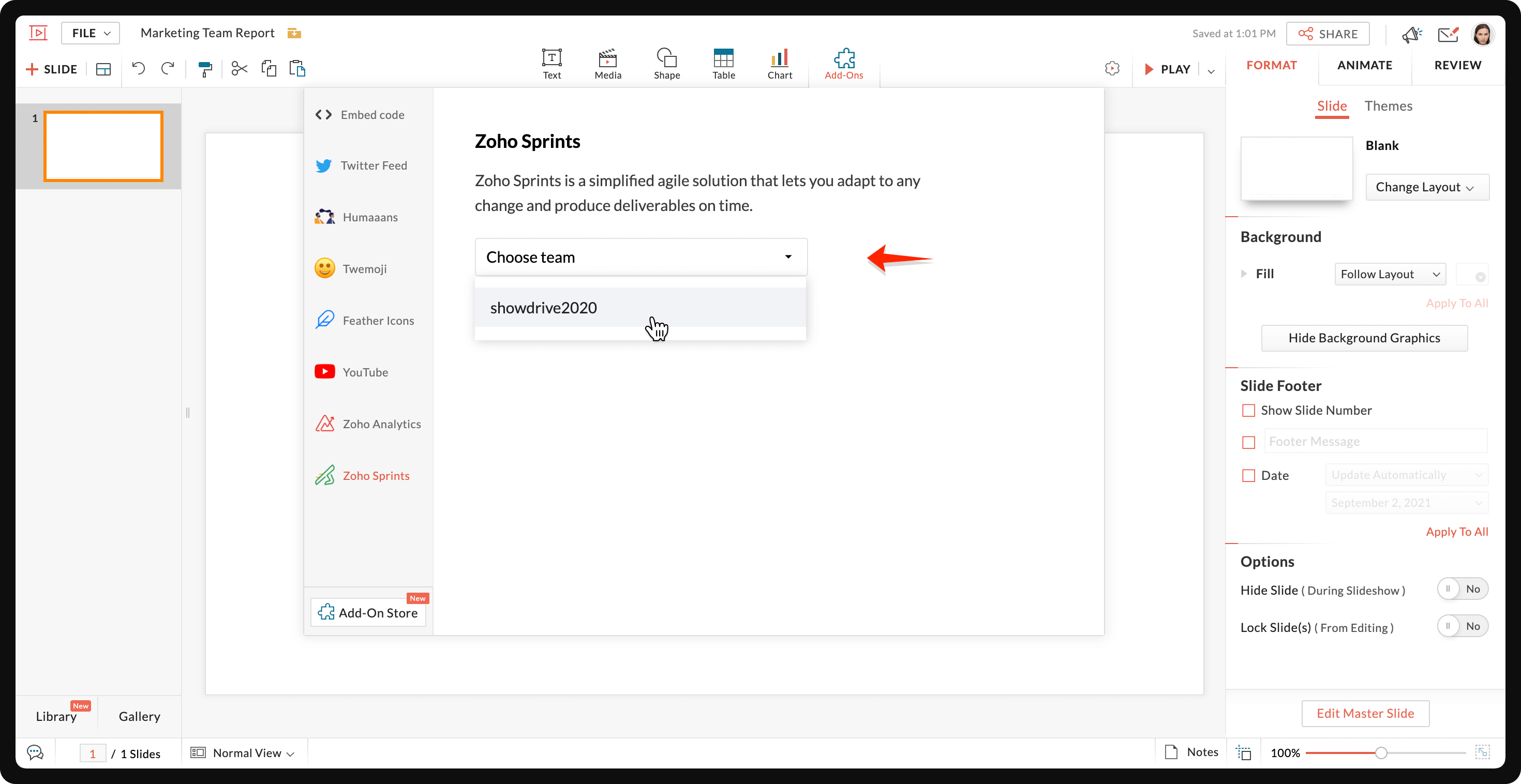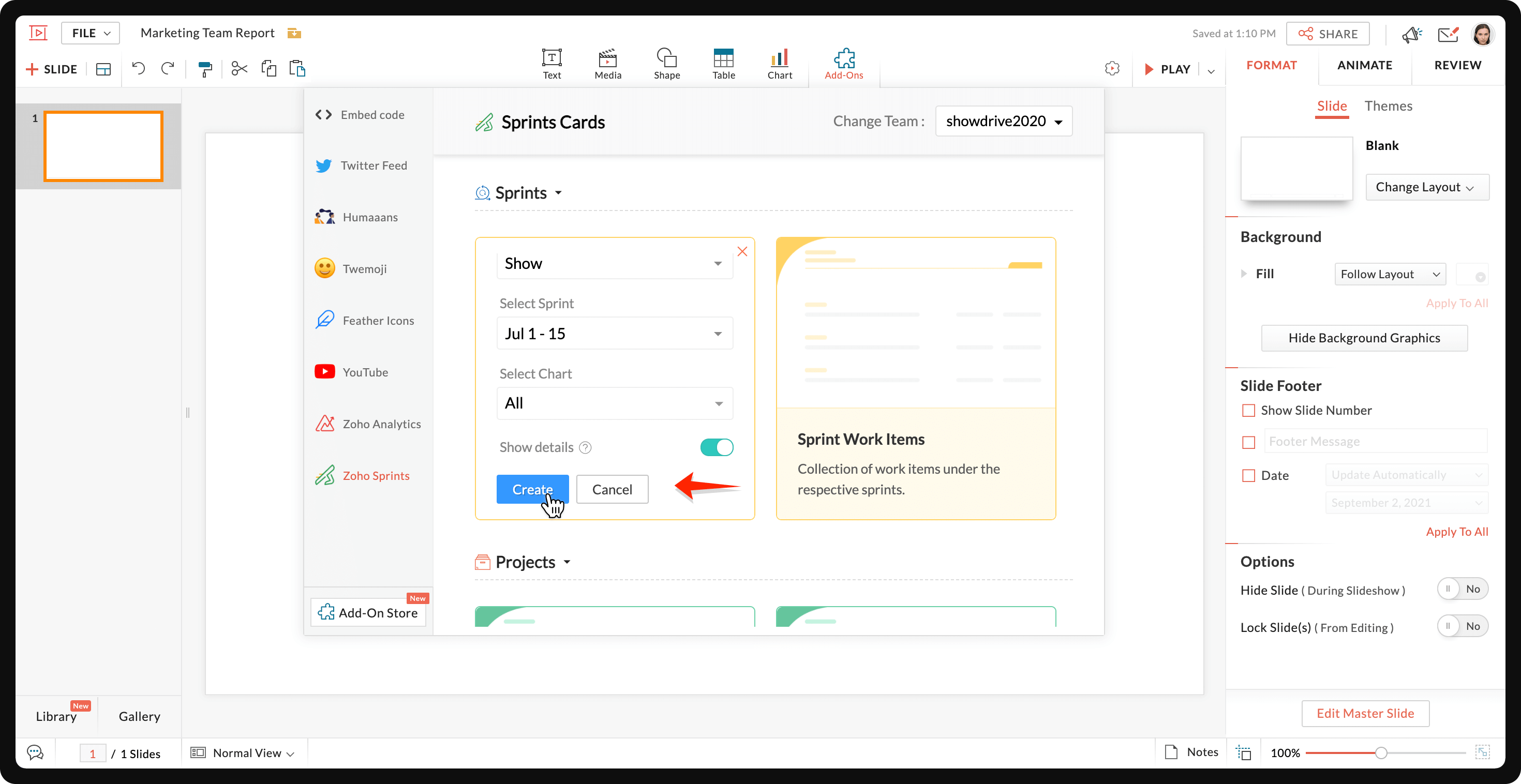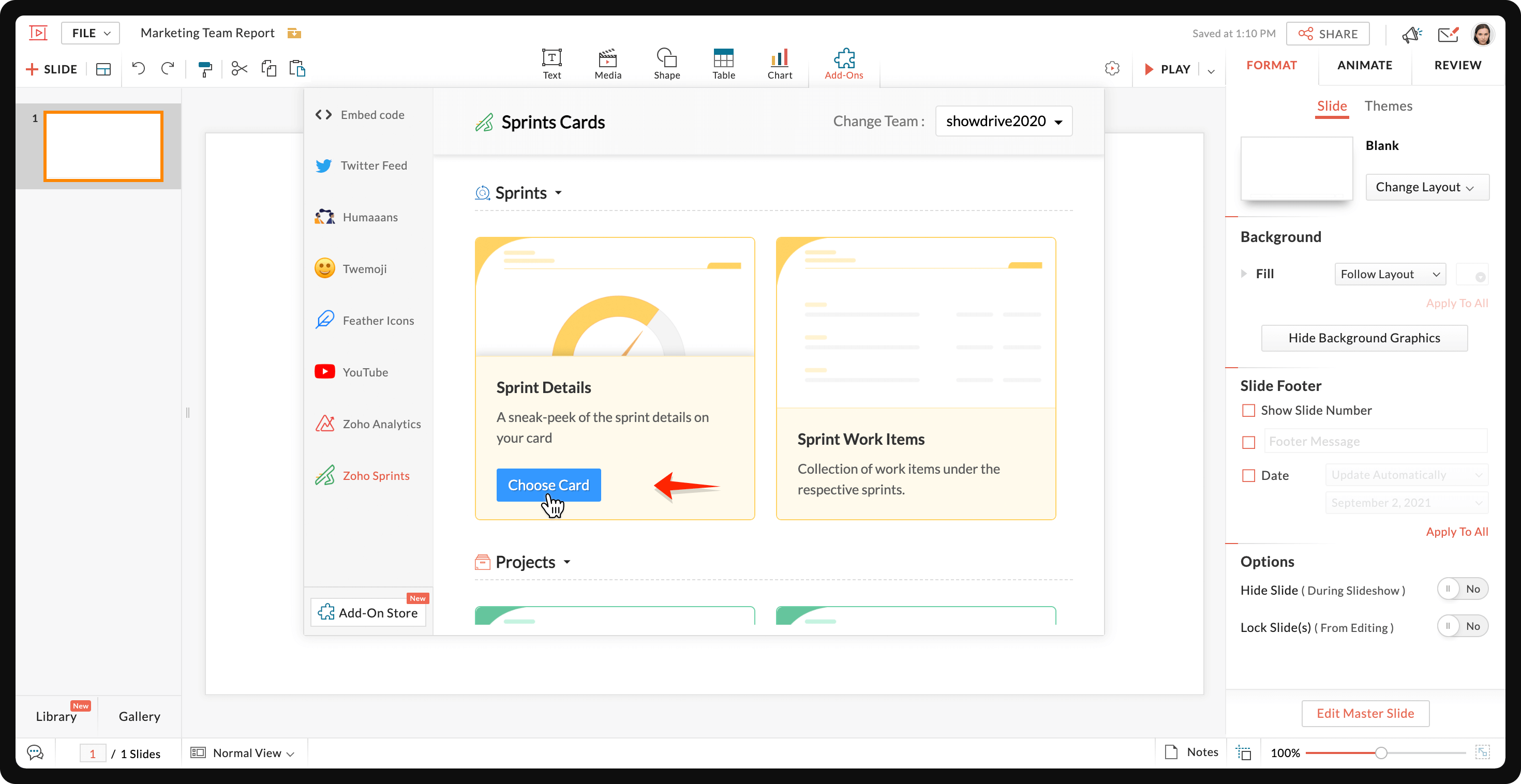 Let's say you are going to deliver a presentation about an ongoing project (developed using agile methodology) to your manager. In such a case, you may want to include a few reports in the presentation so they can easily track and monitor the project's status. To help you with this and eliminate the need for you to navigate to a project management tool for downloading reports, we at Zoho Show have integrated with Zoho Sprints. You can now display every detail of your project on a slide deck using a wide range of visual elements called Sprints Cards.