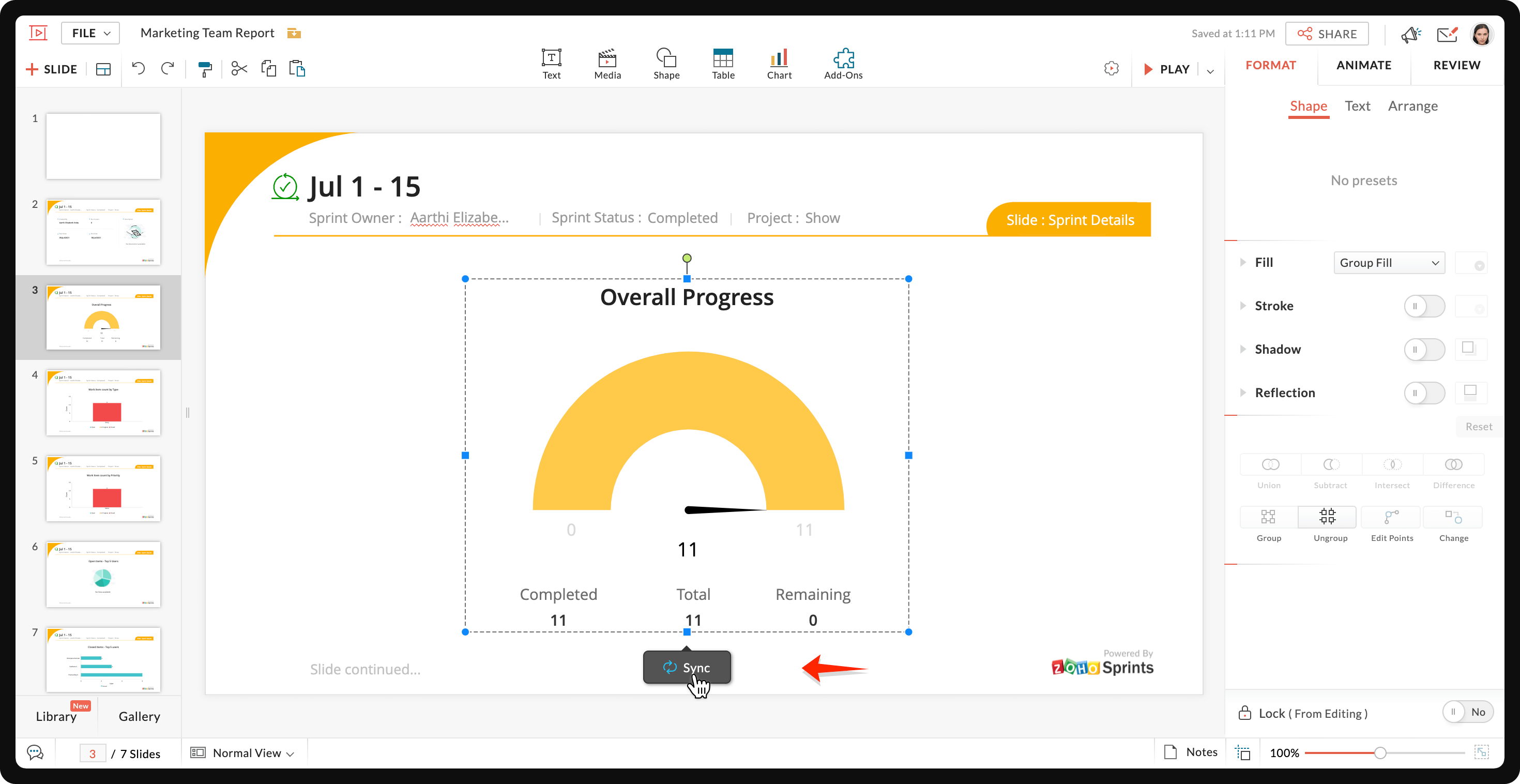 A report will be generated on the slide. You can sync any changes made to the report with a simple click.