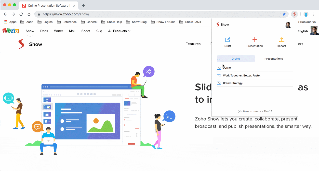 How to convert drafts into presentations using Zoho Show on Chrome browser.