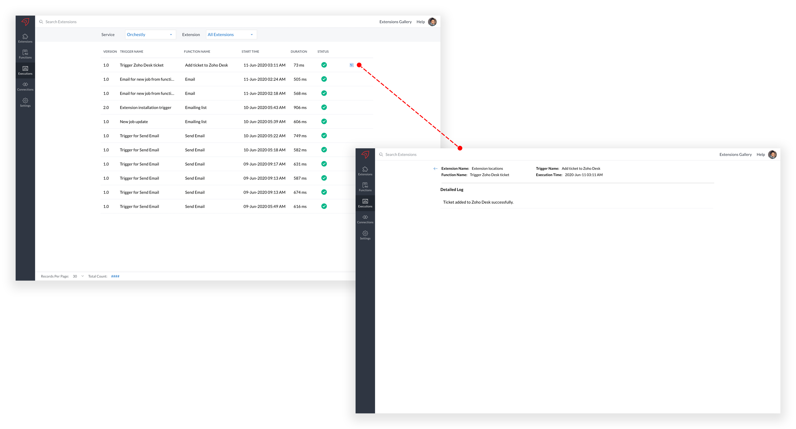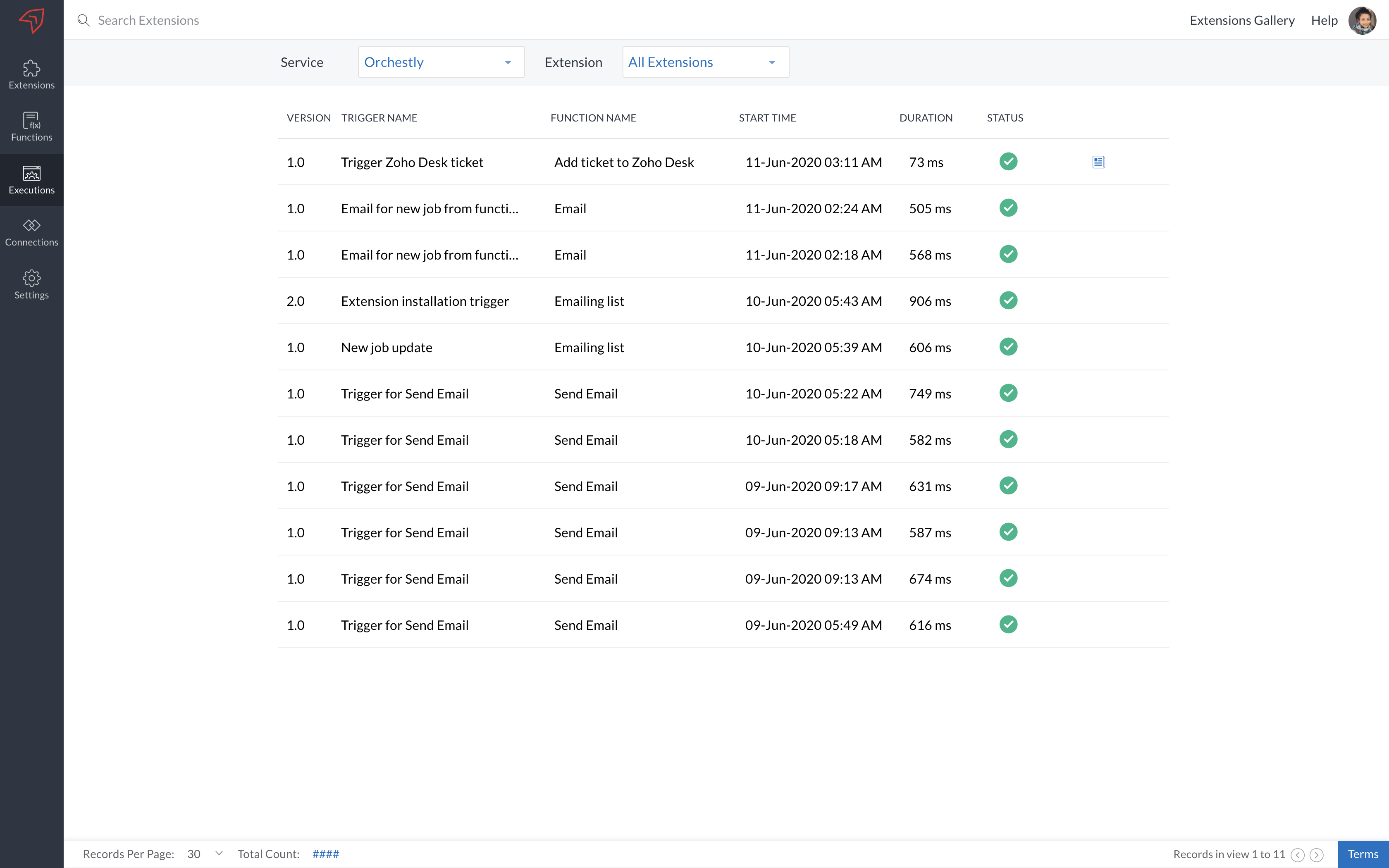 Executions tab displays the list of triggers executed in your extensions. Along with the trigger name and its version, you can also view the function to which the trigger is associated, start time of the execution, duration of the execution, and its status. This functionality is critical when one wants to track the number of executions for particular triggers.