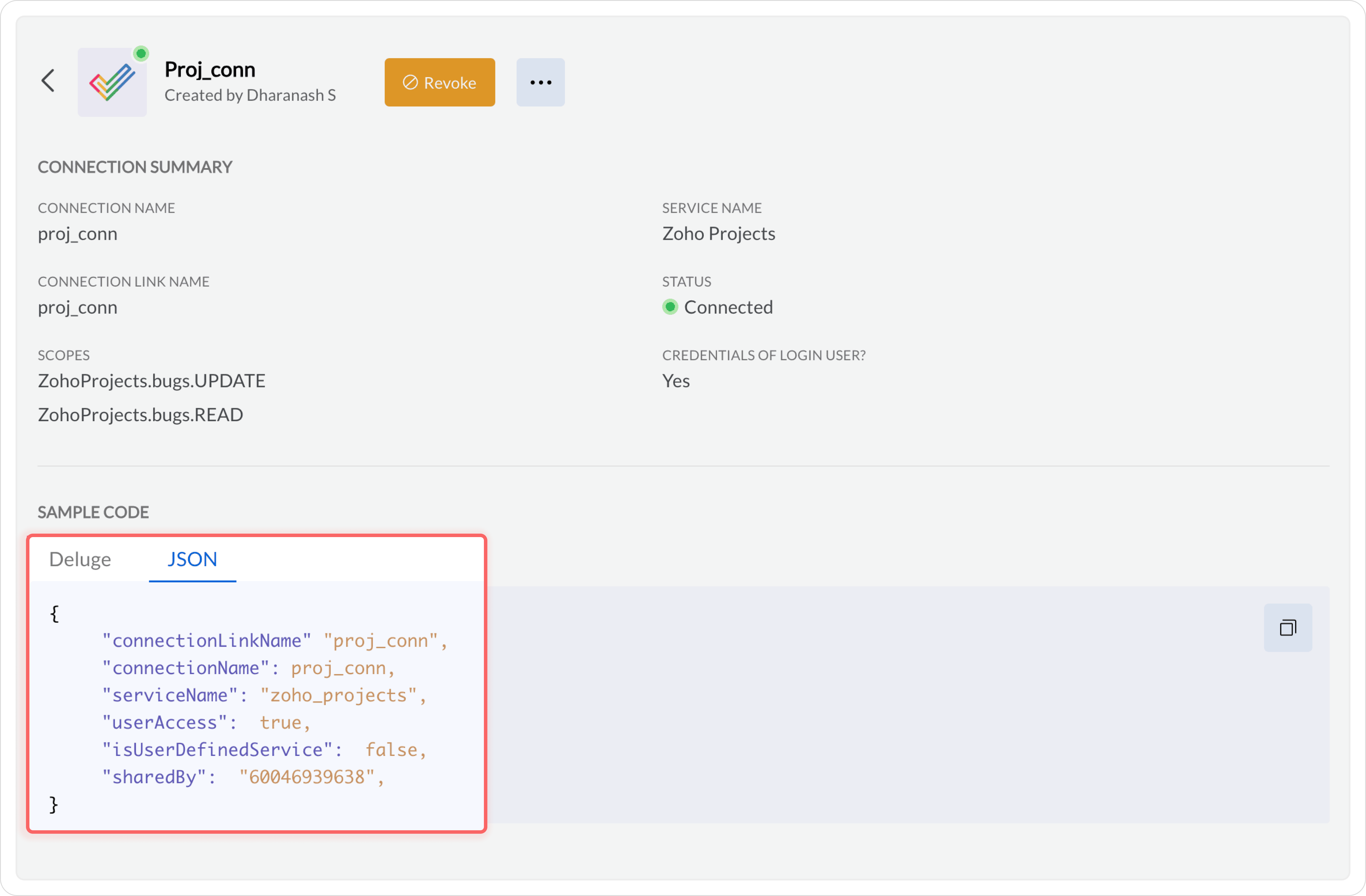 After publishing the connection, a connection JSON will be available under the Sample Code section.