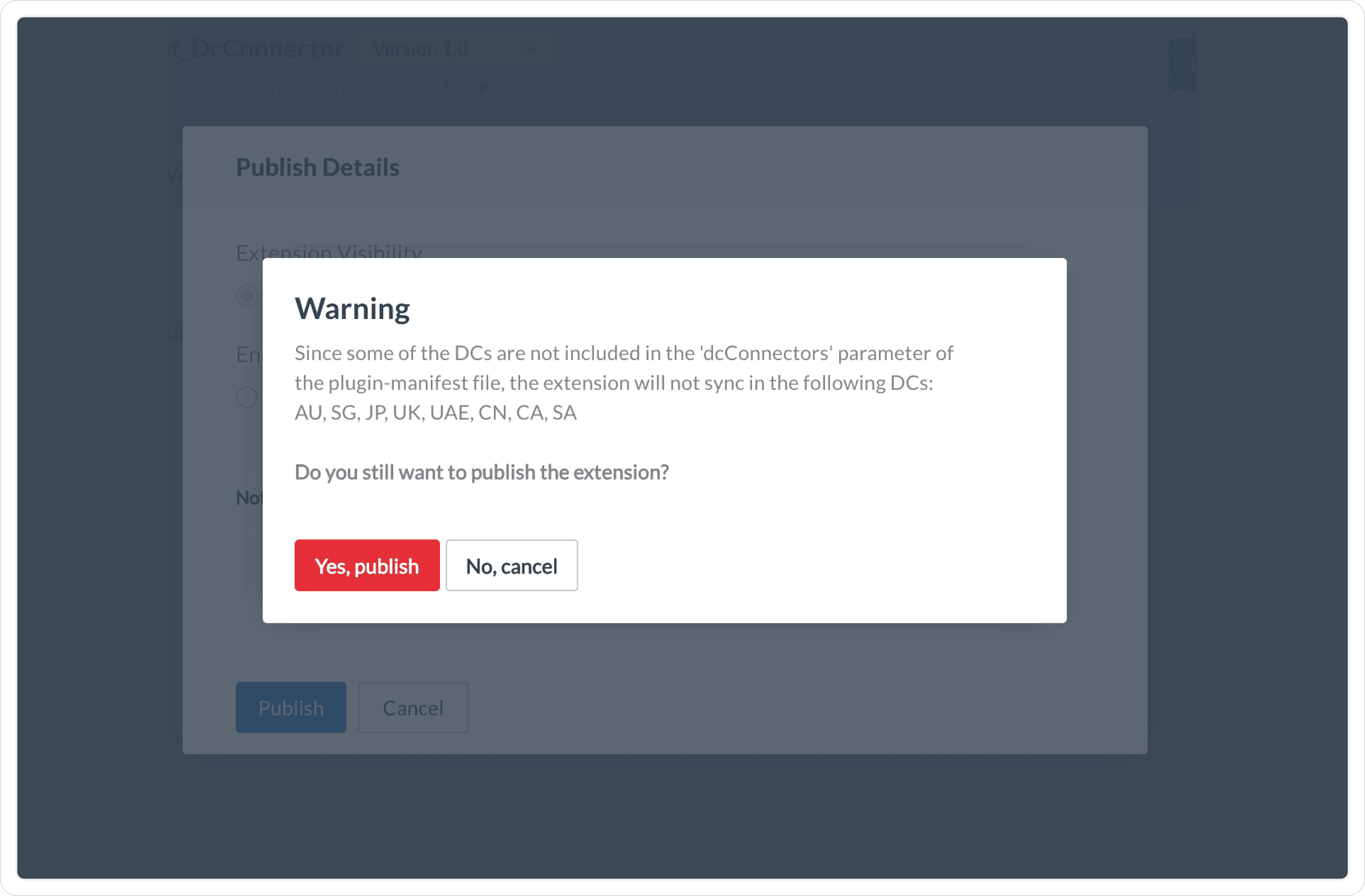 While you publish an extension, you'll be prompted to choose the publishing details of the extension (as in the screenshot below). If you choose Yes to enable Multi-DC, the extension will be published across the following data centres: US, IN, AU, EU, CN, JP, CA, and SA. This action is irreversible. This Multi-DC sync feature is available for both Public and Private extensions.