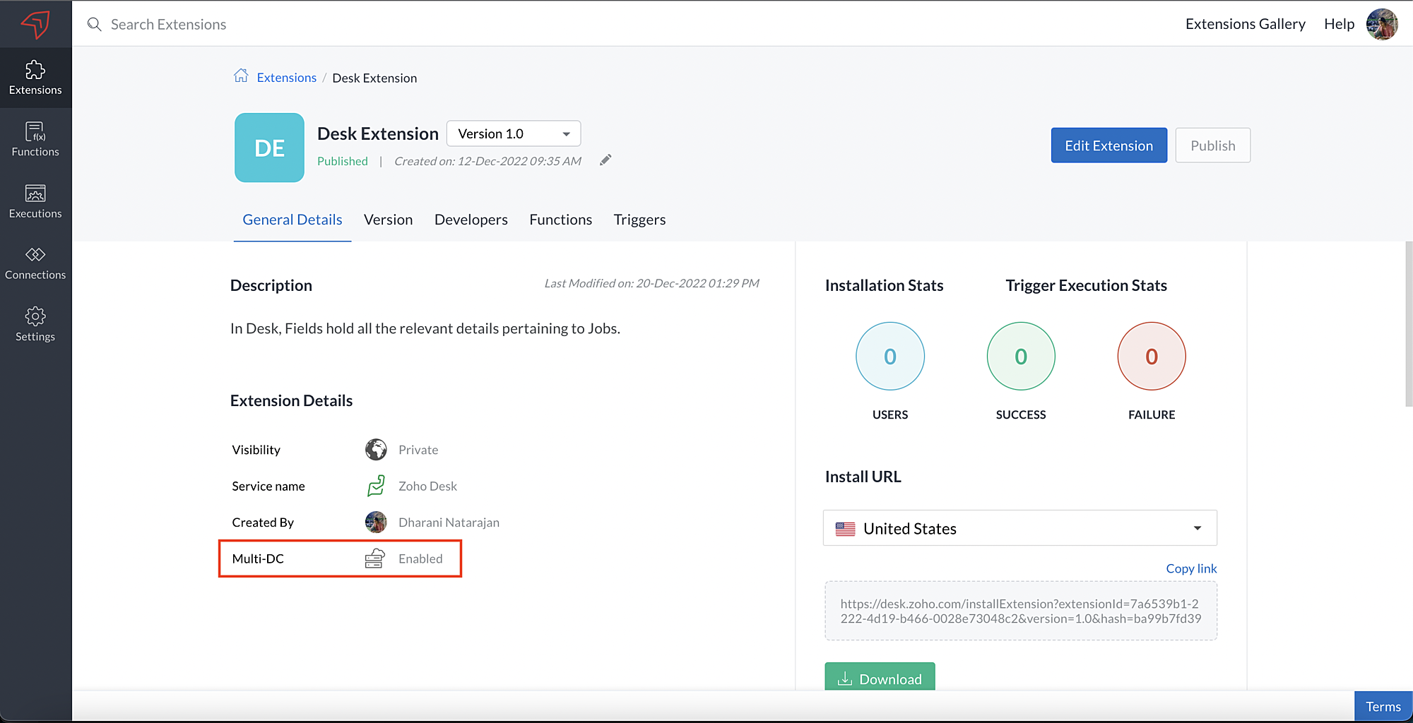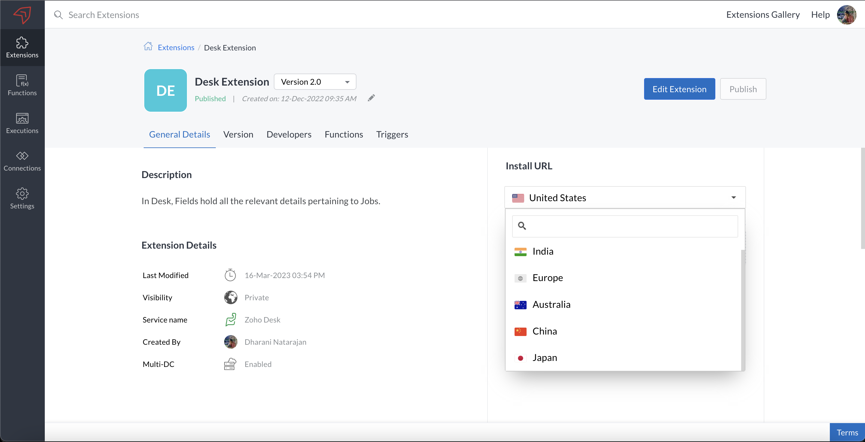 For Private extensions, Install URL for each DC can be generated when you choose the respective DC from the drop-down. This URL can be shared with users to install the extension in the respective DCs. On the other hand, Public extensions will be listed in the respective Marketplace for the users to install.