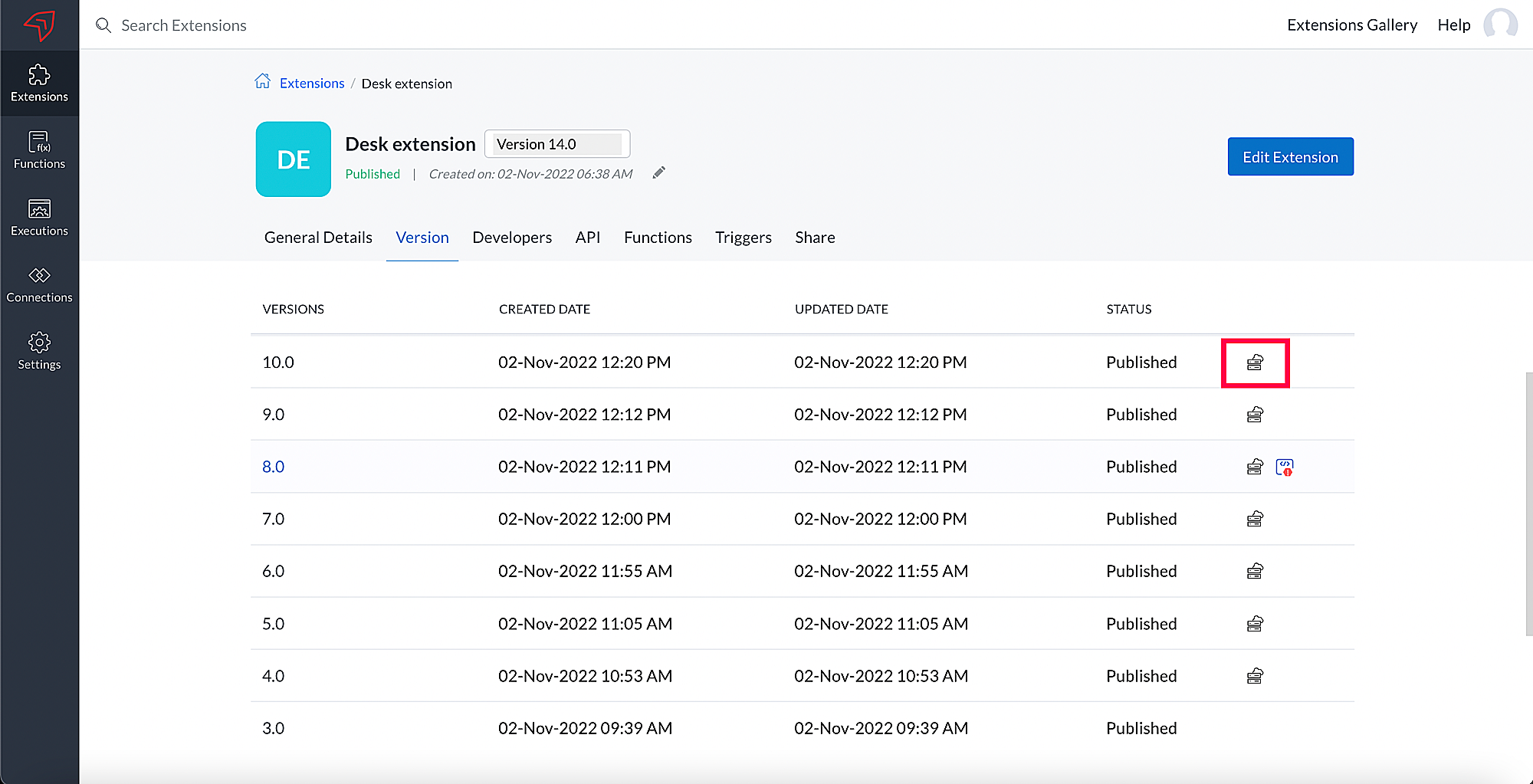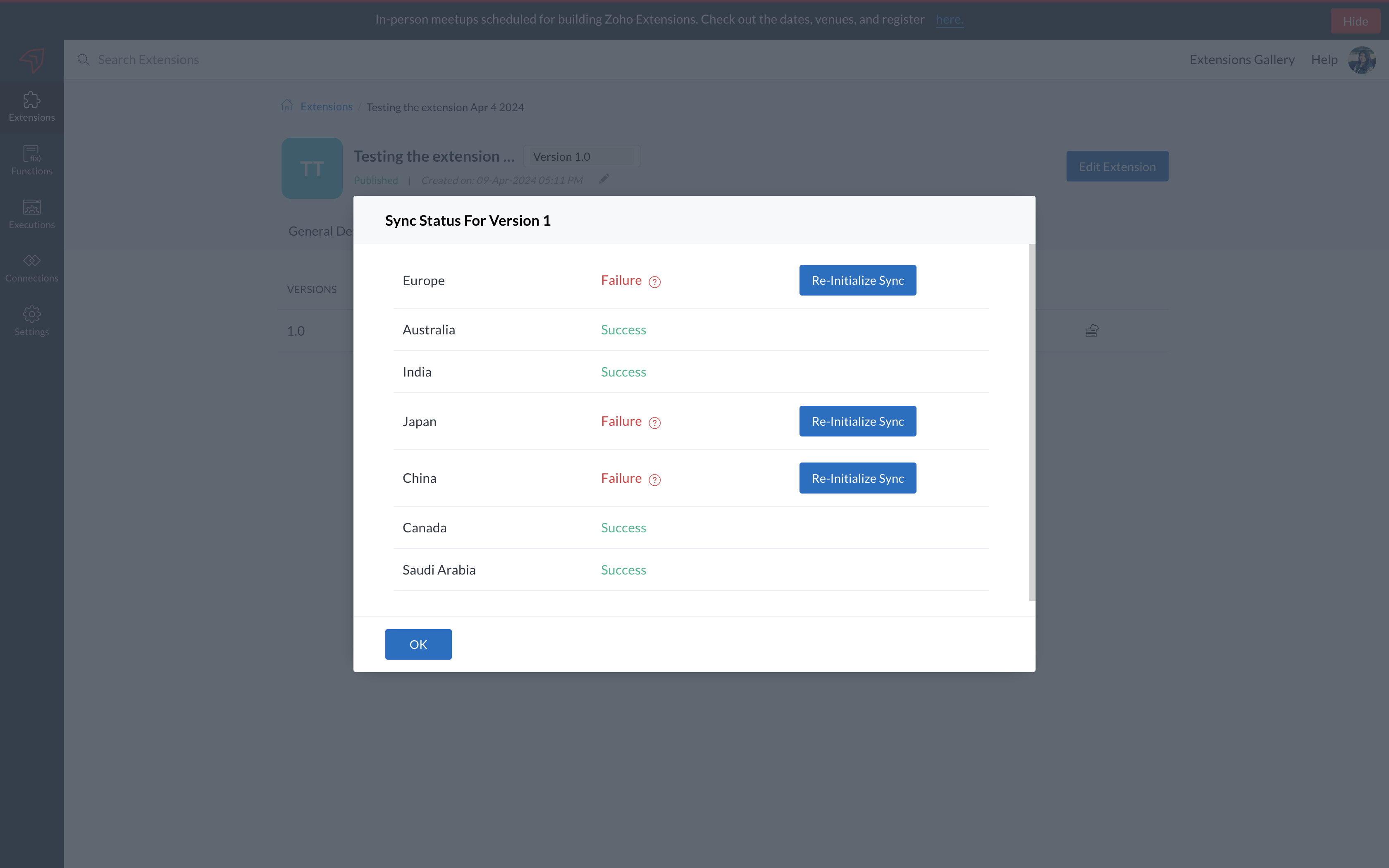 Currently, we support US, IN, AU, EU, CN, JP, CA, and SA data centers. When support for a new DC is introduced, you can enable it for your existing extensions as well by clicking Initialize Sync.