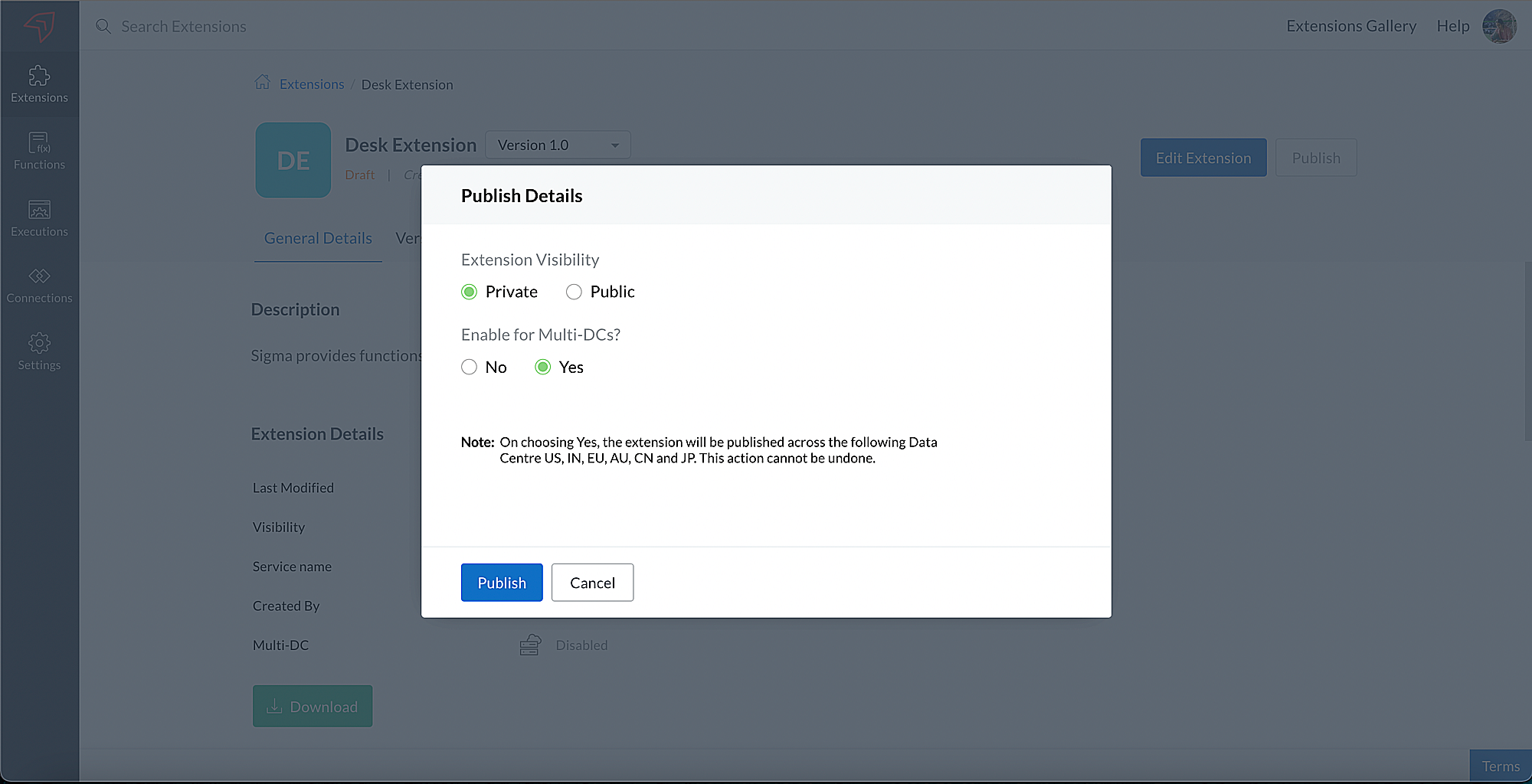 to enable Multi-DC, the extension will be published across the following data centres: US, IN, AU, EU, CN, JP, CA, and SA. This action is irreversible. This Multi-DC sync feature is available for both