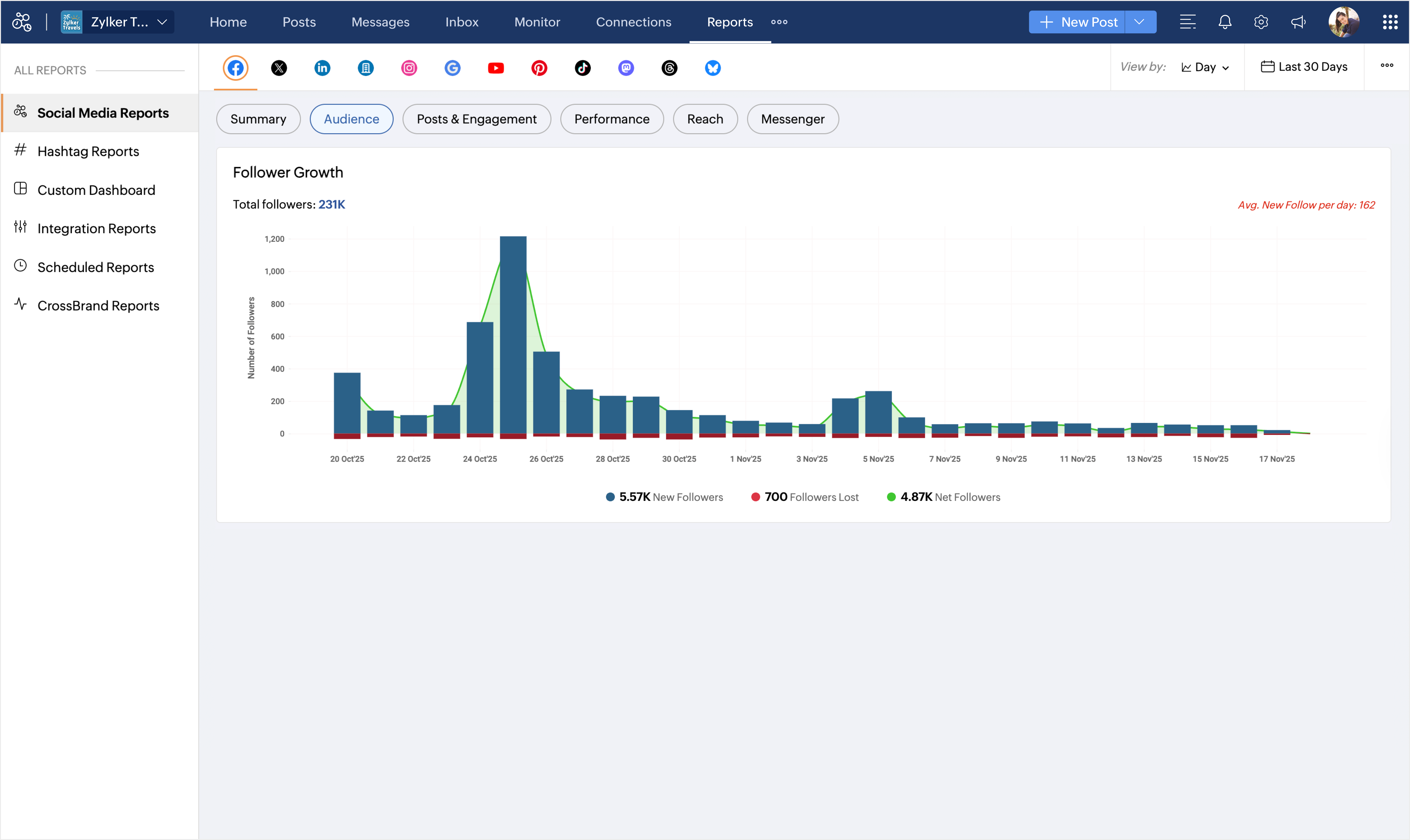 - New followers - The number of new followers obtained over a period of time and the average new followers per day.