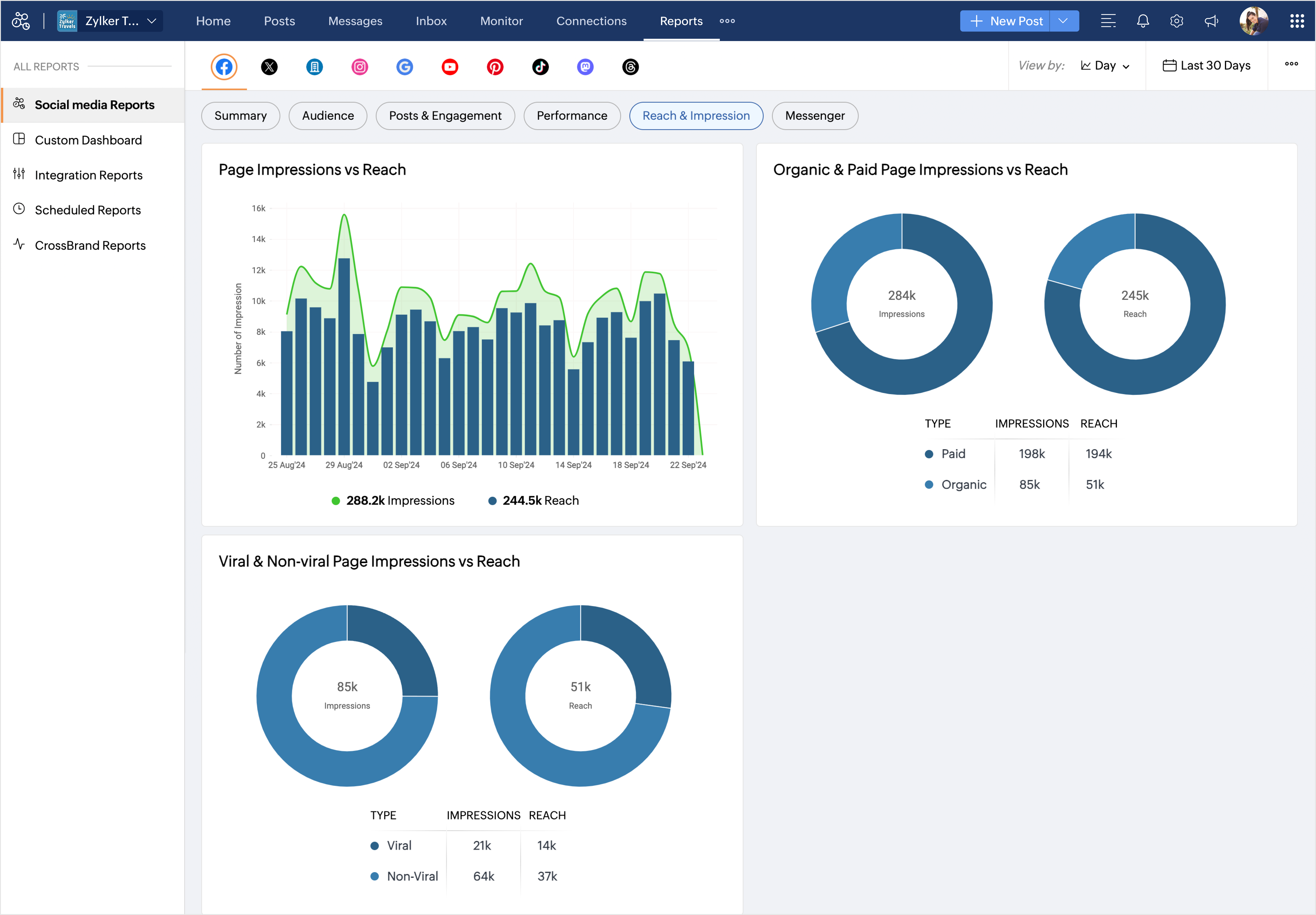 Organic & page paid page impressions vs reach - The comparison of the total number of times your posts were displayed on users' screens organically versus through paid ads, with the total number of people who viewed the posts organically versus through paid ads.