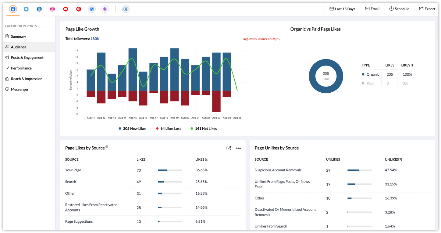 Page like growth - This displays a visual comparison of the number of likes obtained vs the number of likes lost per day, over a period of time. Similarly, the total number of followers and the average new followers obtained per day can also be viewed.