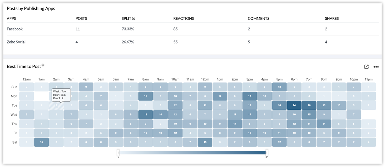 Best time to post - The best time to post on your Facebook page depending on the performance of your previous posts. The denser the color, the higher the engagement for the posts during that time range.