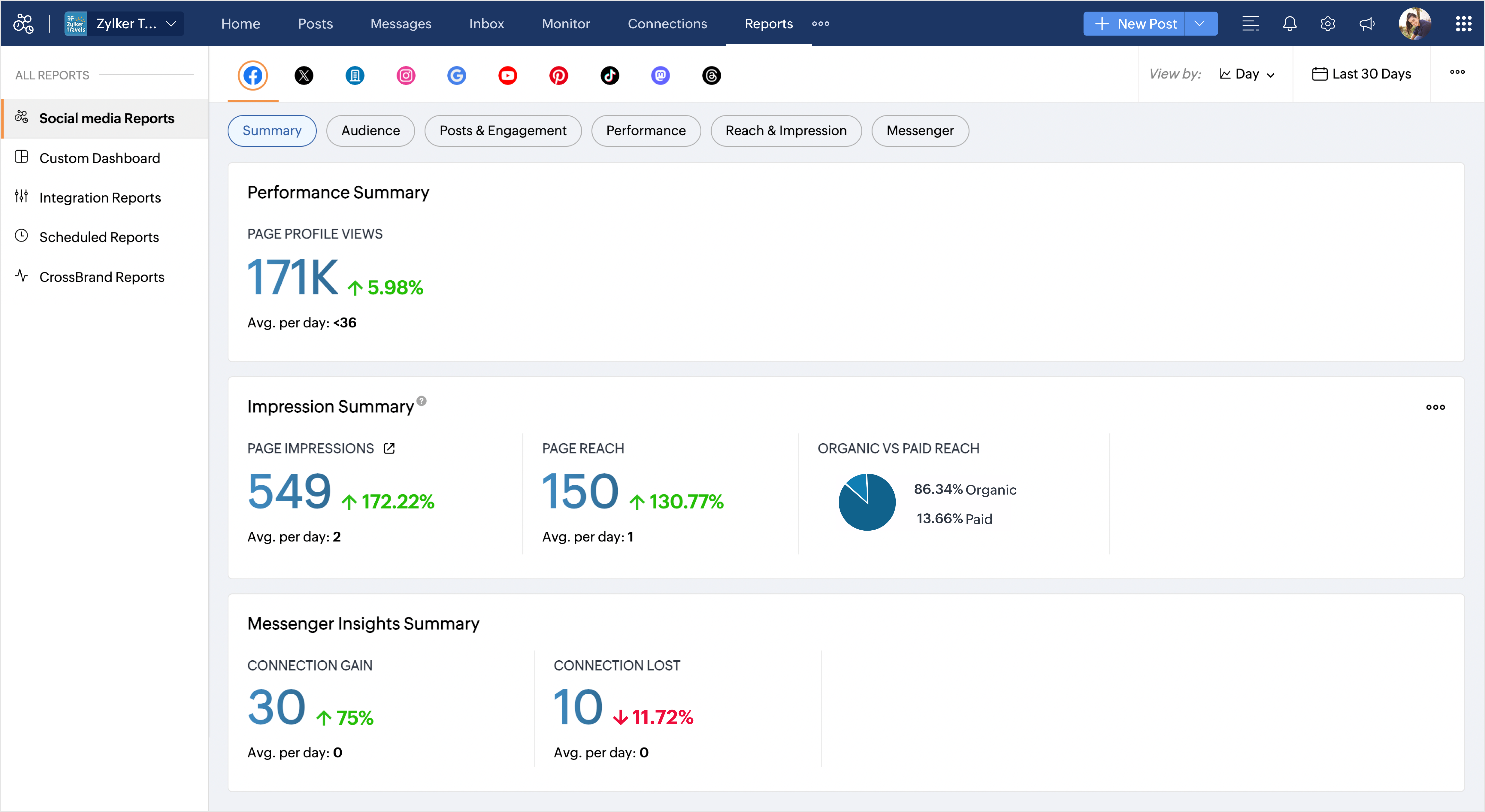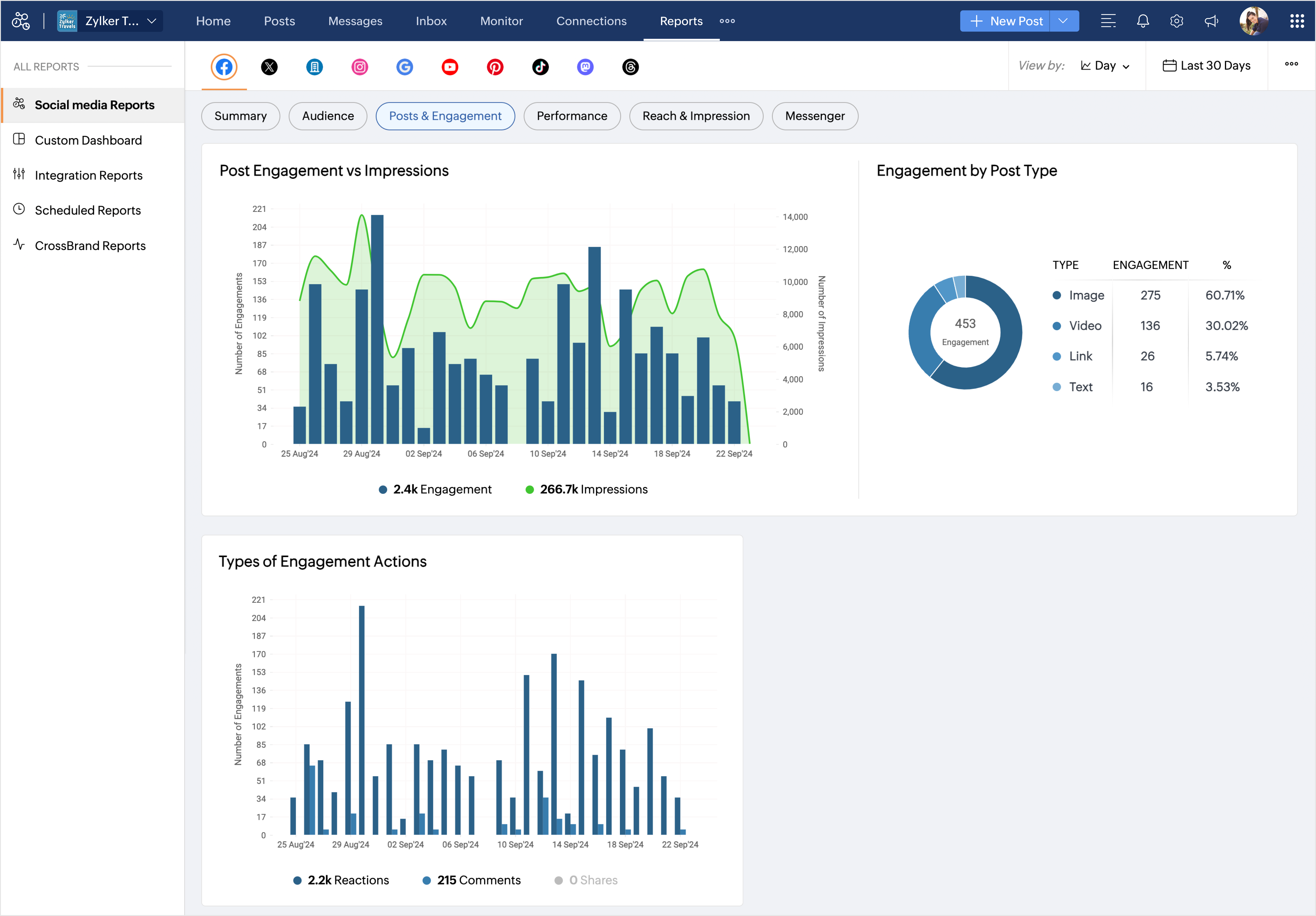 Post and Engagement Summary - This card displays metrics through which you can understand how your Facebook posts are doing and how well the audience is engaging with them.