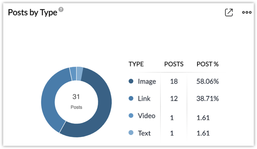Posts by type - The distribution of the different types of posts like image, link, text, and video can be viewed here.