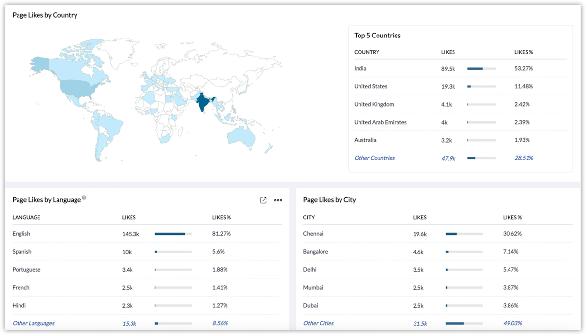 Page likes by country - The countries from which the likes have been obtained for the page can be viewed on the map. The denser the color of the country, the higher are the number of likes. The Top five countries that have contributed to the likes can also be found here.