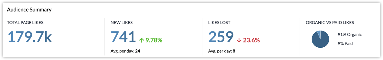 Audience Summary - This card displays metrics explaining the number of likes on your Facebook page, and how the likes were acquired, as listed below: