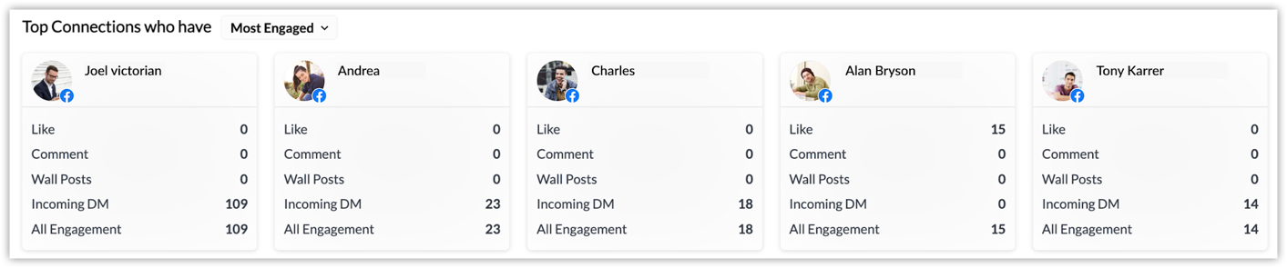 Top connections - The top connections based on most liked, most commented, most mentioned, most messaged, and most engaged are listed here.