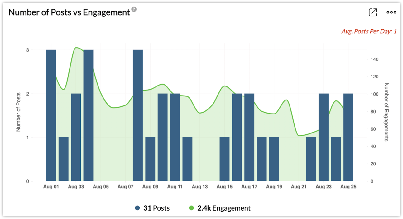Number of posts vs engagement - The number of posts made on your Facebook page and the total engagement received for the posts over a period of time. The average number of posts published per day can also be viewed.