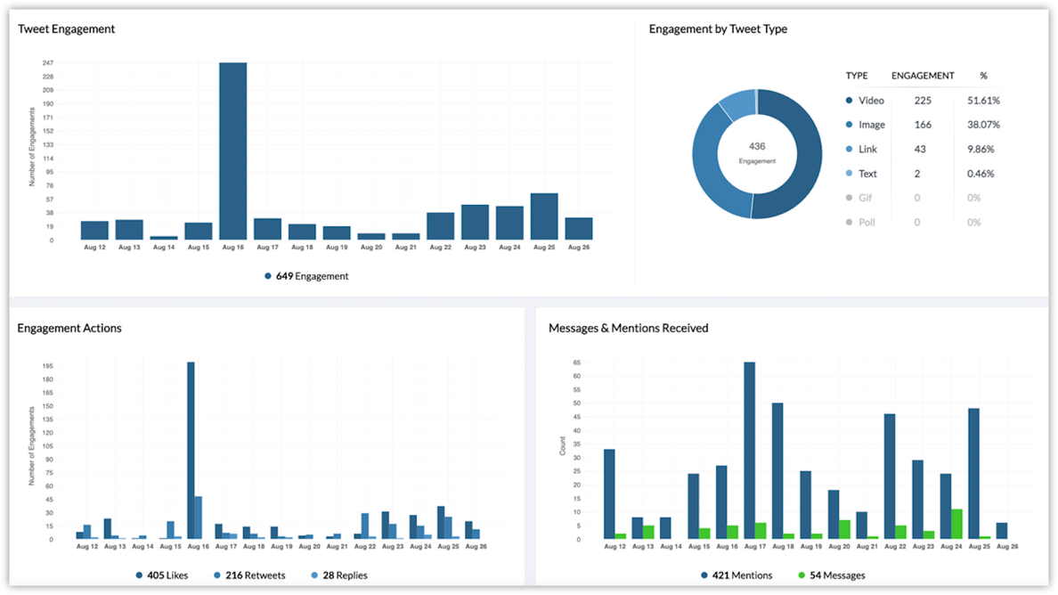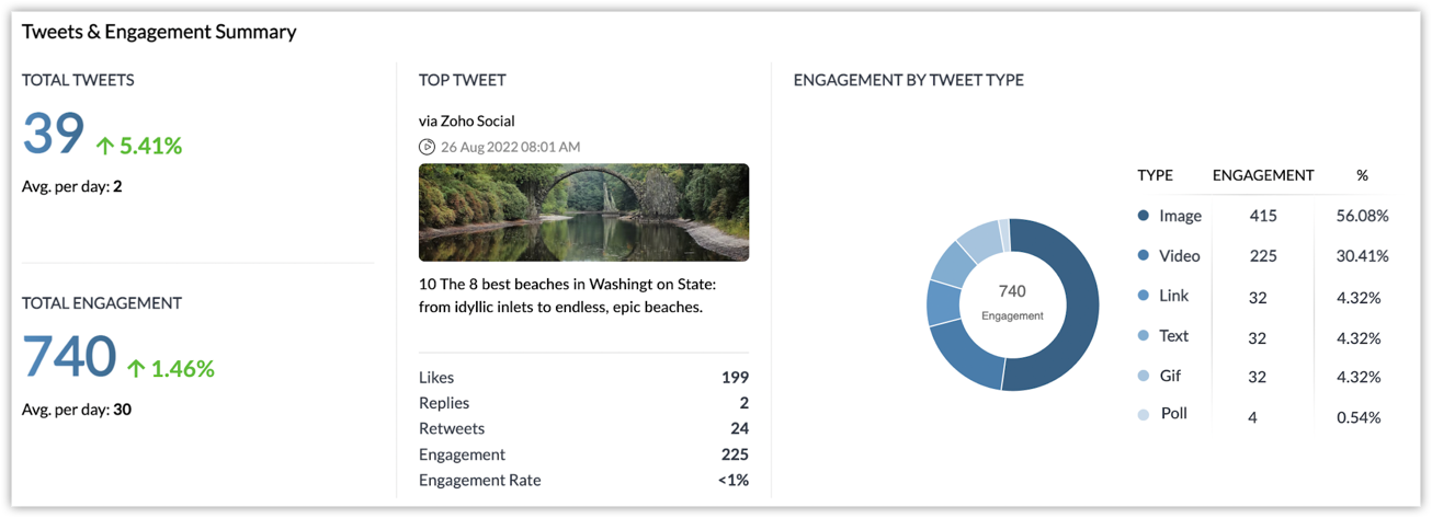 - Engagement by tweet type - The distribution of engagement received for the different type of tweets like video, image, link, text, gif, and poll.