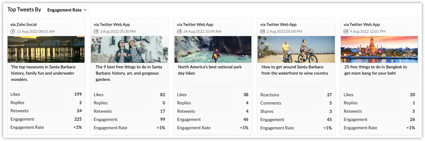 Top tweets - The top performing tweets based on likes, replies, retweets, engagement, and engagement rate.