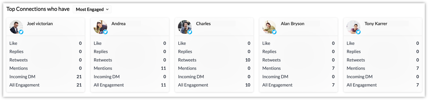 Top connections - The top connections who have liked, replied, retweeted, mentioned, messaged, and engaged the most on your posts are listed here.