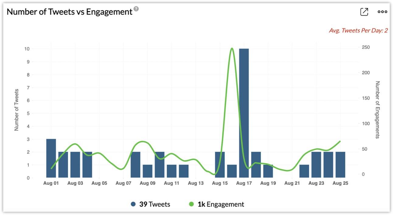 Number of tweets vs engagement - The number of tweets published on your Twitter profile and the total engagement received for them over a period of time. The average tweets per day can also be seen.