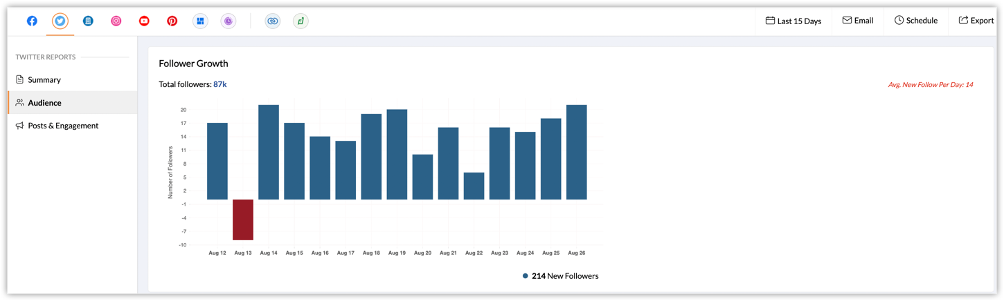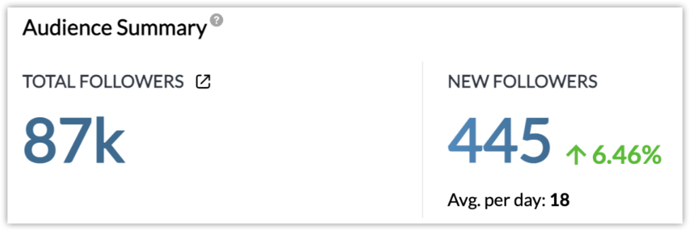 Follower growth - The total followers, number of followers gained or lost on your Twitter profile, and the average new followers gained per day.