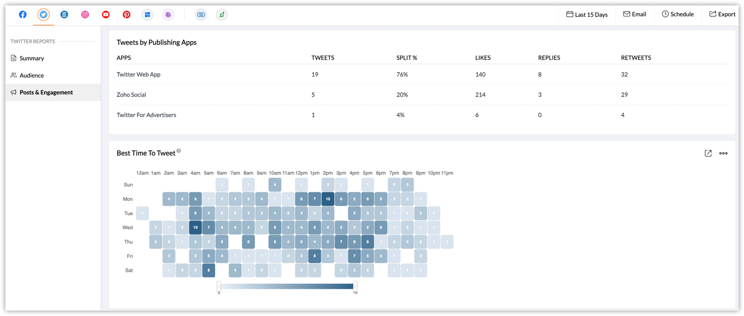 The analytics available for Twitter helps understand how your tweets are performing in line with your business growth. Social lets you measure the impact and reach of your content through various metrics like top tweets, total engagement, and top connections.
