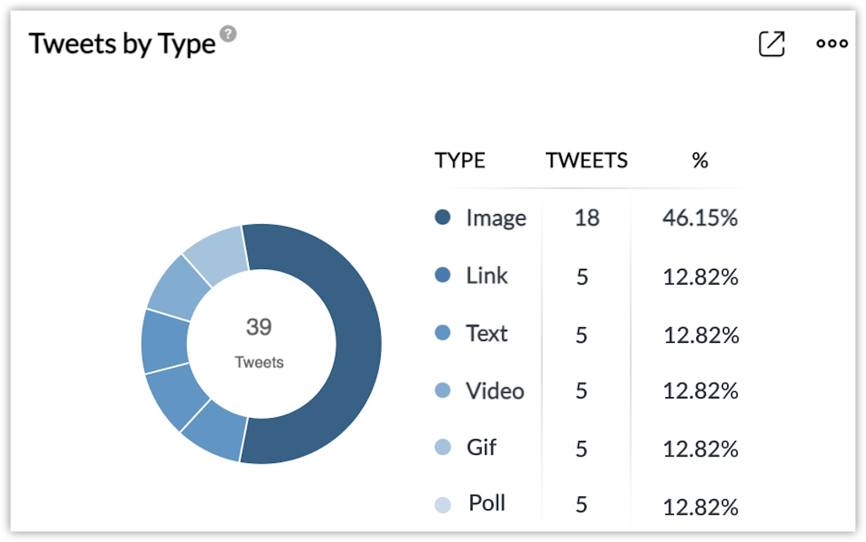 Tweets by type - The different types of tweets based on the content such as video, image, link, text, gif, and poll.