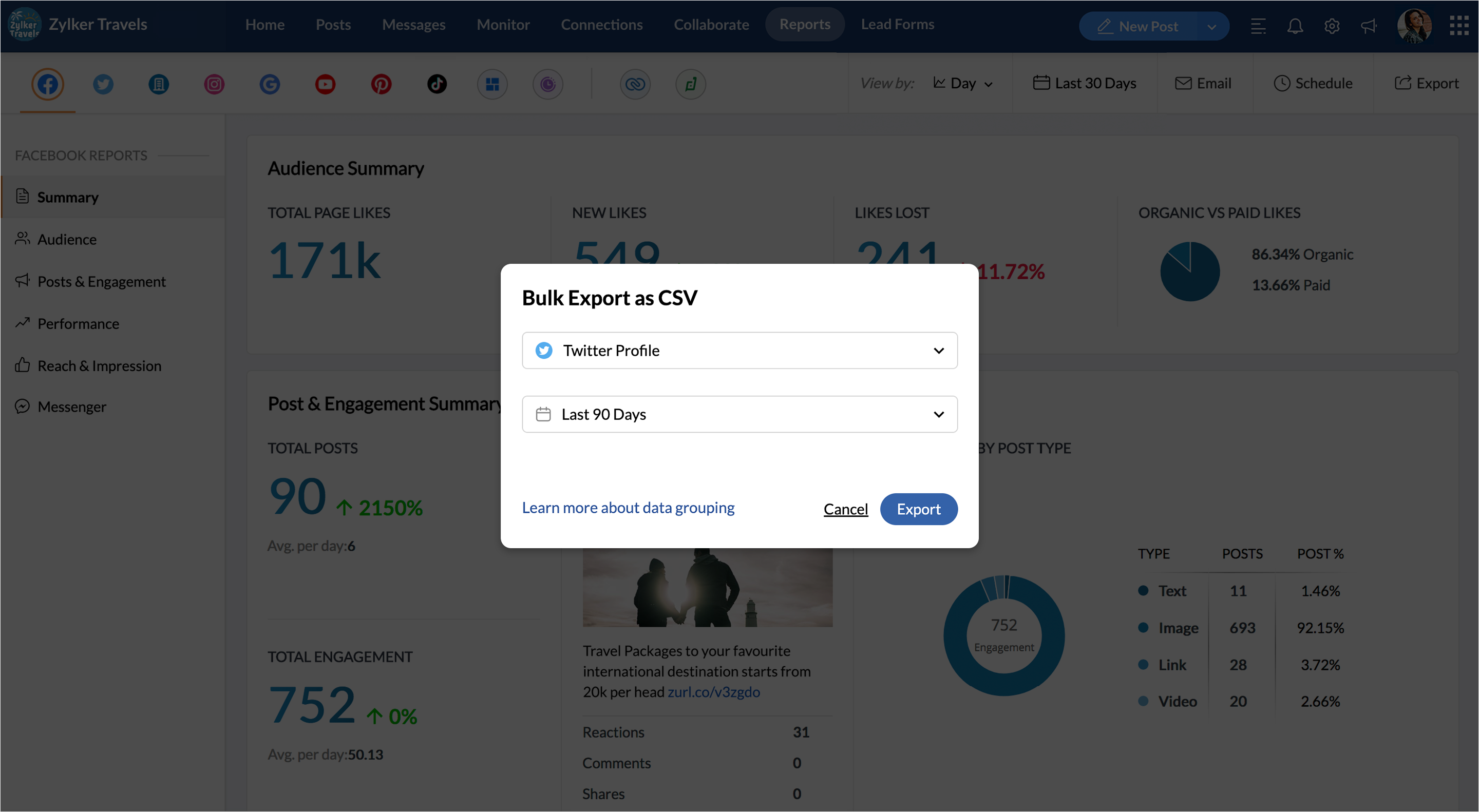 You can bulk export reports for Facebook Page, Twitter Profile, LinkedIn Company Page, Google Business Profile, Instagram Profile, YouTube Channel, and TikTok Profile.