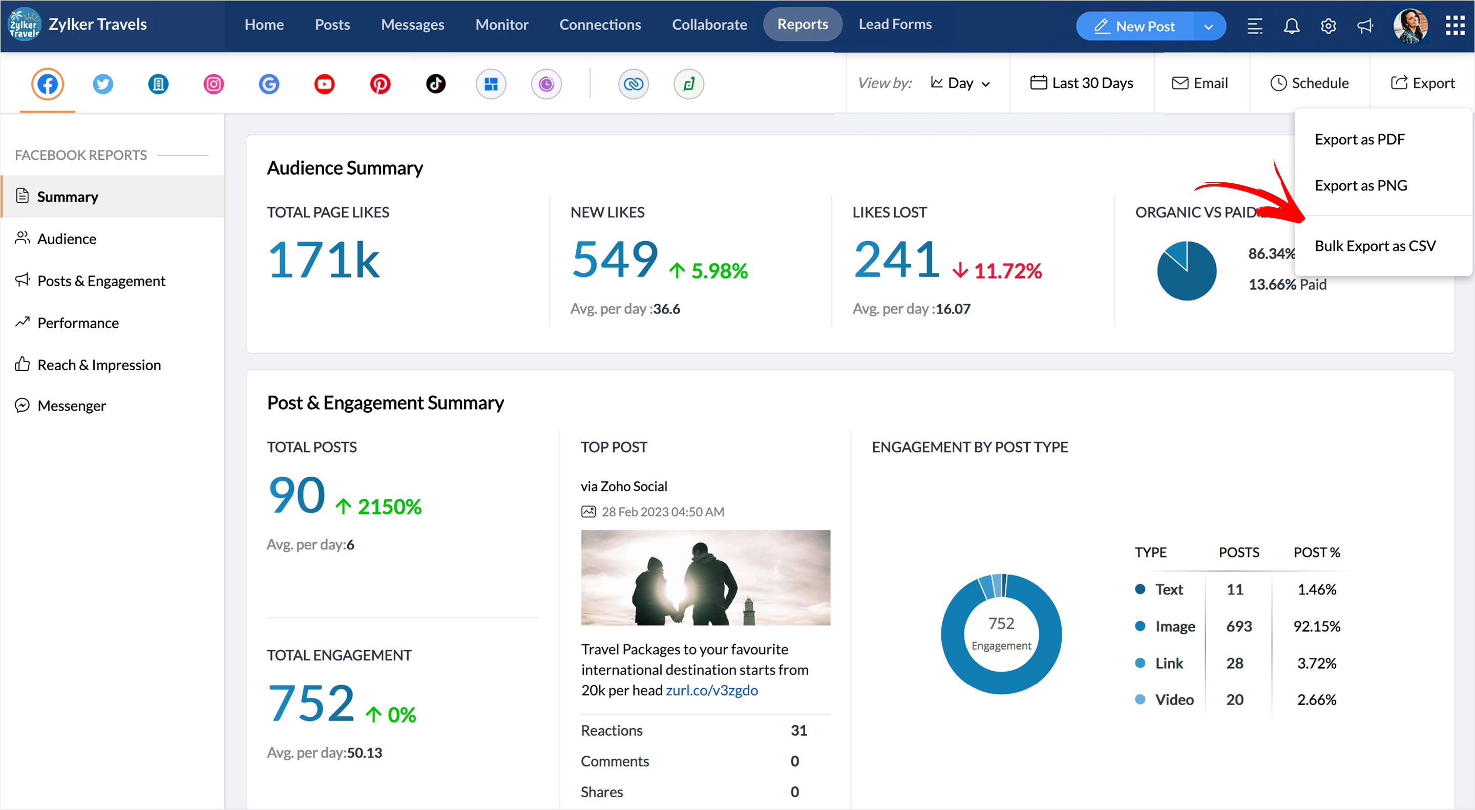 Cards and specific network reports, or the entire Reports section can be exported as different file formats like PNG, PDF, or CSV files on Zoho Social.