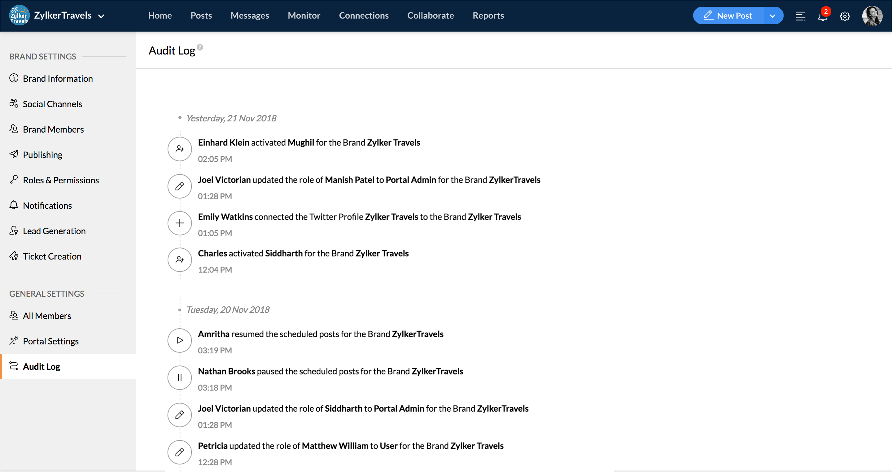 You can monitor this activity directly from the Audit Log available in  Zoho Social. The Audit log displays a chronological log of all the key actions performed by Brand Admins and Portal Admins. From here, the Portal Admin can find live data ...