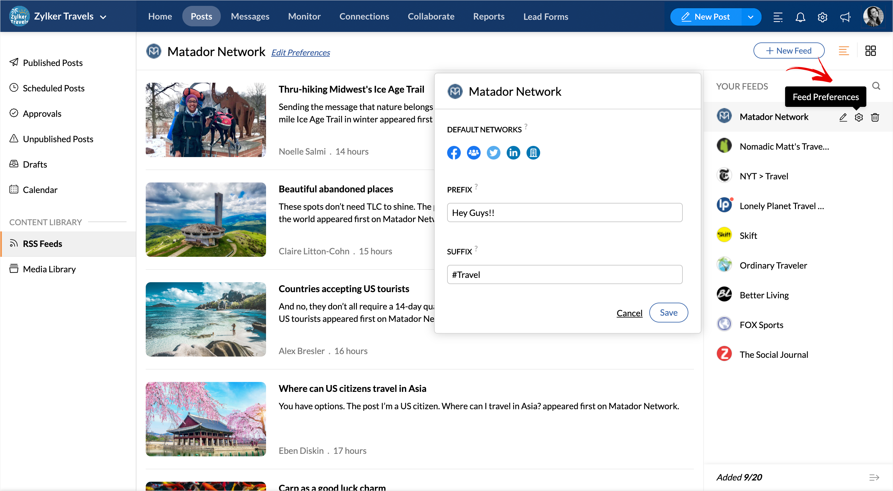 1. Hover over the feed name you have added to edit your preference and click on the gear icon (Feed Preferences).