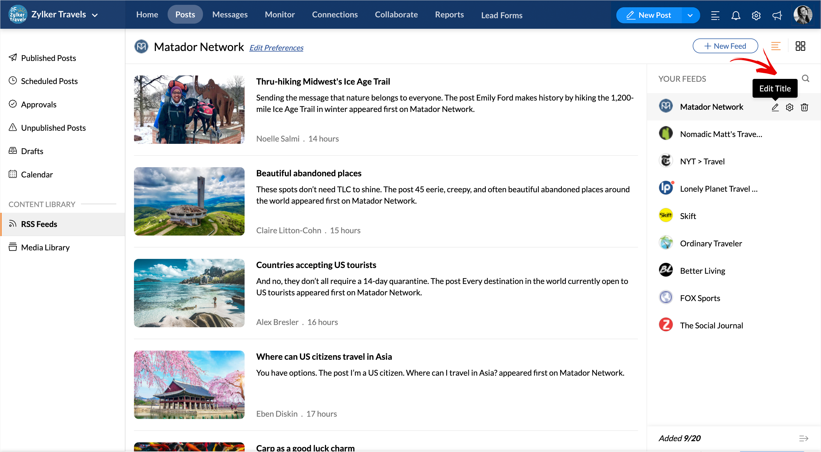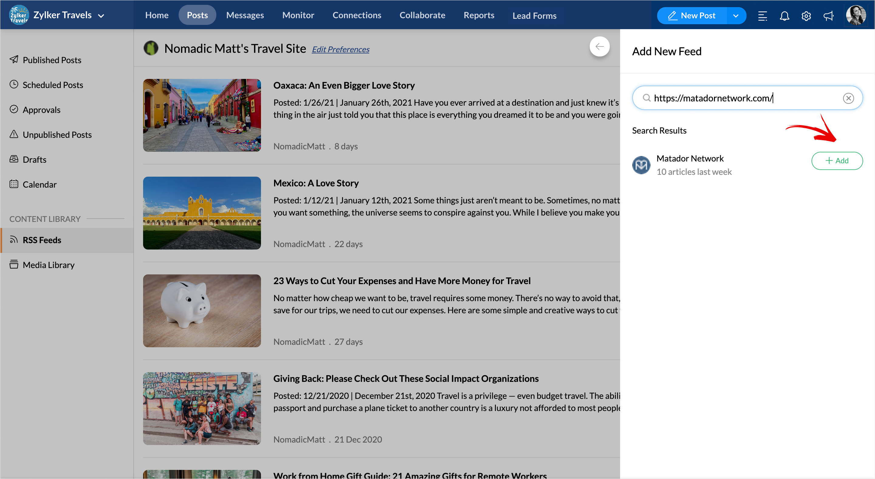 RSS Feeds is a one-stop solution if you consume new content and updates from specific websites that you follow. With the RSS Feeds Dashboard on Zoho Social, you can curate a stream of new content which you like to read delivered straight to you, and publish them seamlessly to your social media channels, all from one screen.